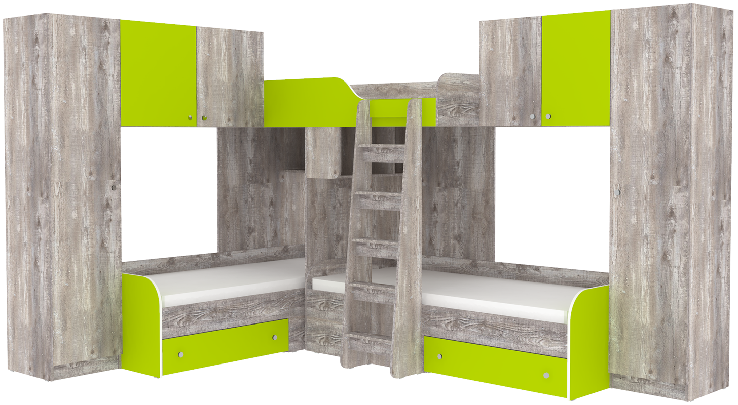 Трехместная кровать с полноценными спальными местами стала еще вместительнее. Два больших шкафа с каждой стороны позволять разместить теперь точно все вещи Ваших детей.Характеристики