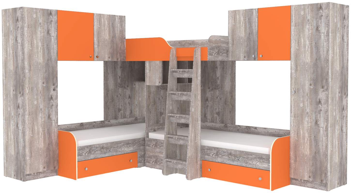 Трехместная кровать с полноценными спальными местами стала еще вместительнее. Два больших шкафа с каждой стороны позволять разместить теперь точно все вещи Ваших детей.Характеристики