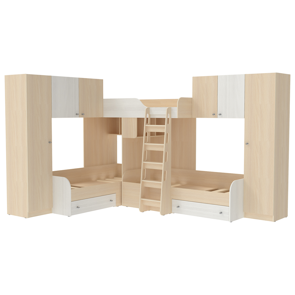 Трехместная кровать с полноценными спальными местами стала еще вместительнее. Два больших шкафа с каждой стороны позволять разместить теперь точно все вещи Ваших детей.Характеристики