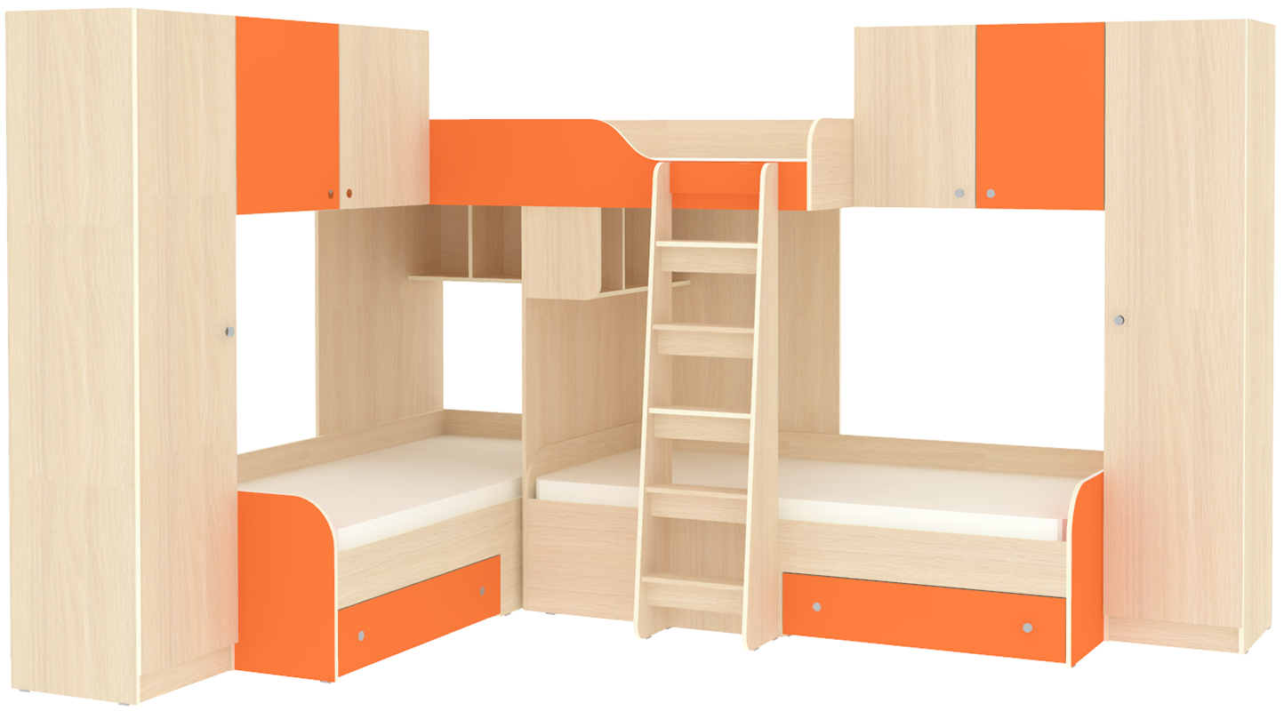 Трехместная кровать с полноценными спальными местами стала еще вместительнее. Два больших шкафа с каждой стороны позволять разместить теперь точно все вещи Ваших детей.Характеристики