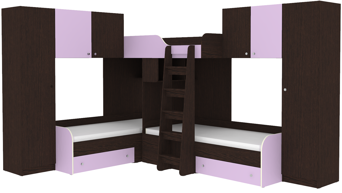 Трехместная кровать с полноценными спальными местами стала еще вместительнее. Два больших шкафа с каждой стороны позволять разместить теперь точно все вещи Ваших детей.Характеристики