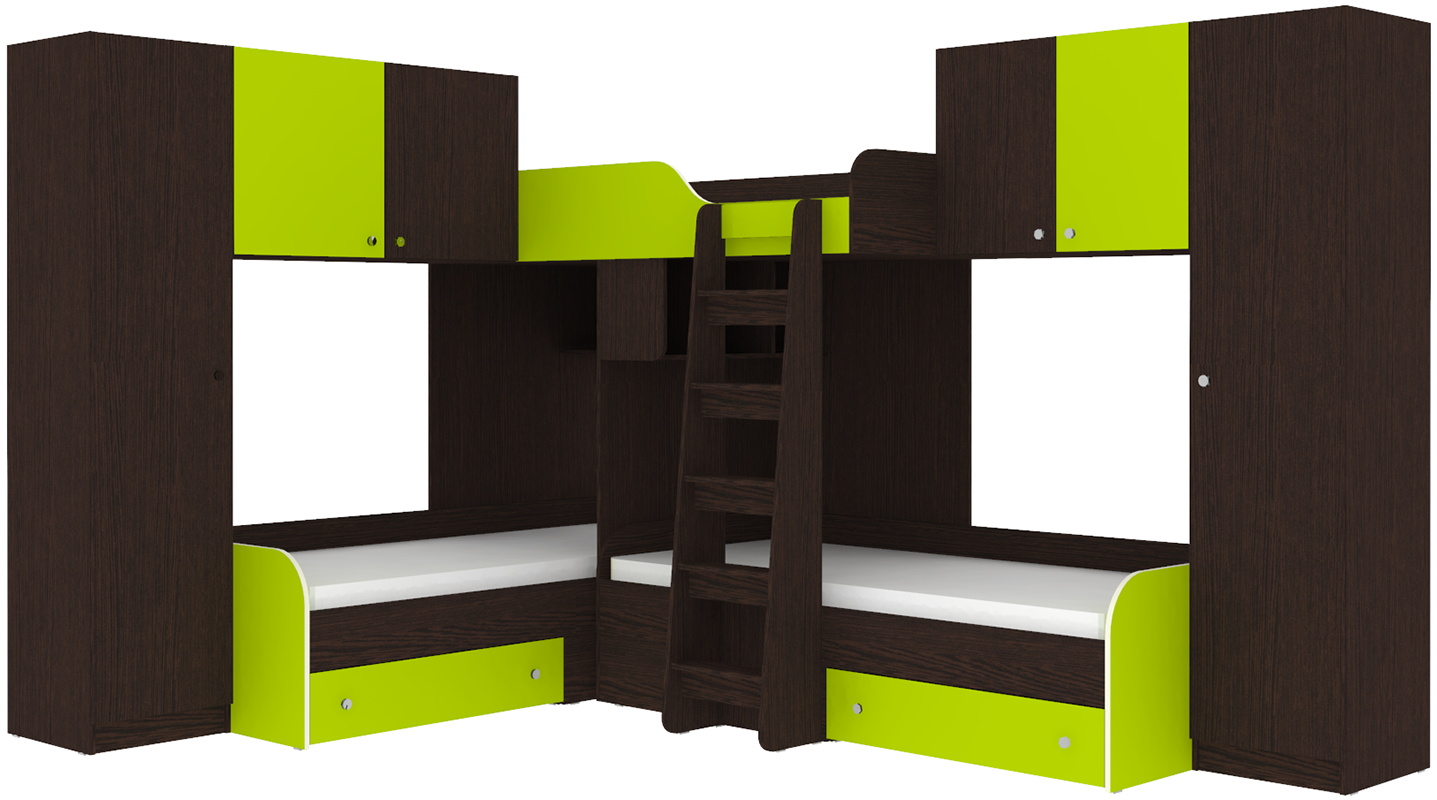 Трехместная кровать с полноценными спальными местами стала еще вместительнее. Два больших шкафа с каждой стороны позволять разместить теперь точно все вещи Ваших детей.Характеристики