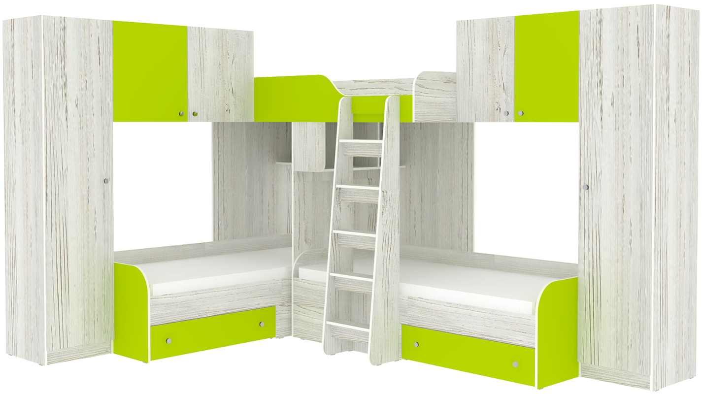Трехместная кровать с полноценными спальными местами стала еще вместительнее. Два больших шкафа с каждой стороны позволять разместить теперь точно все вещи Ваших детей.Характеристики