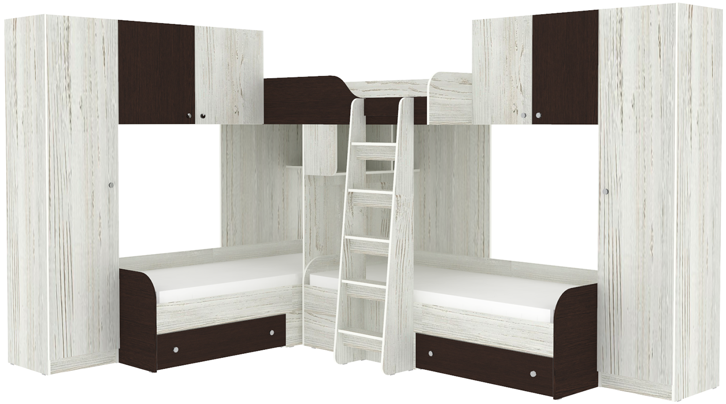 Трехместная кровать с полноценными спальными местами стала еще вместительнее. Два больших шкафа с каждой стороны позволять разместить теперь точно все вещи Ваших детей.Характеристики