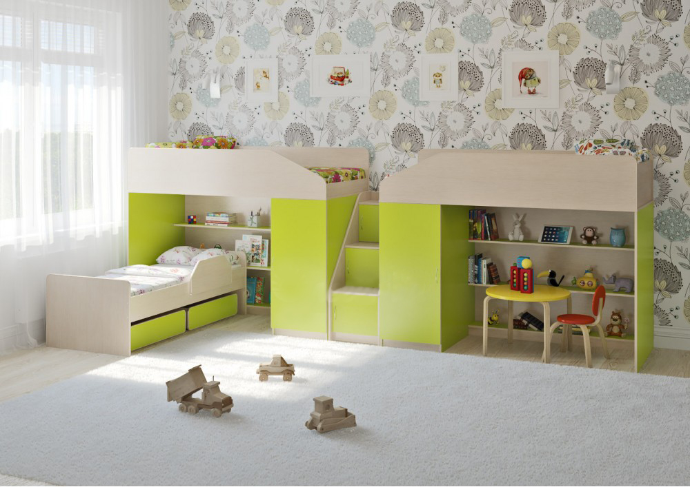 Трехъярусная кроватьЛ-11.13 - уютный комплект мебели для троих детей. В комплект входит: Две кровати-чердакас большим спальным местом размером1800х800. Под спальным местом располагаетсяигровая зона– свой уголок,словно домик для ребенка. В игровой зоне располагаетсястеллаж,состоящий из трех полок.Стеллаж отлично подходит для хранения игрушек,удобен для поддержания порядка и сортировки предметов. Вместительный шкаф с четырьмя полками и штангойдля хранения одежды,белья,игрушек или иных вещей. Световое окно- дополнительное освещение,элемент для игры и возможность родителям наблюдать за ребенком. Боковые бортики и мягкий противоударный кант– дополнительная безопасность для детей. Угловая лестница-стеллаж из трех ступенек надёжна и безопасна.В комплект входят фасады,поэтому стеллаж состоит изтрёх полноценных полок с дверками- удобное дополнительное место для хранения вещей. Классическая кроватьЛ-27 со спальным местом 1600×700. Два высоких боковых бортика для дополнительной безопасности спящего. Комплект может быть собран как на левую, так и на правую сторону.Характеристики