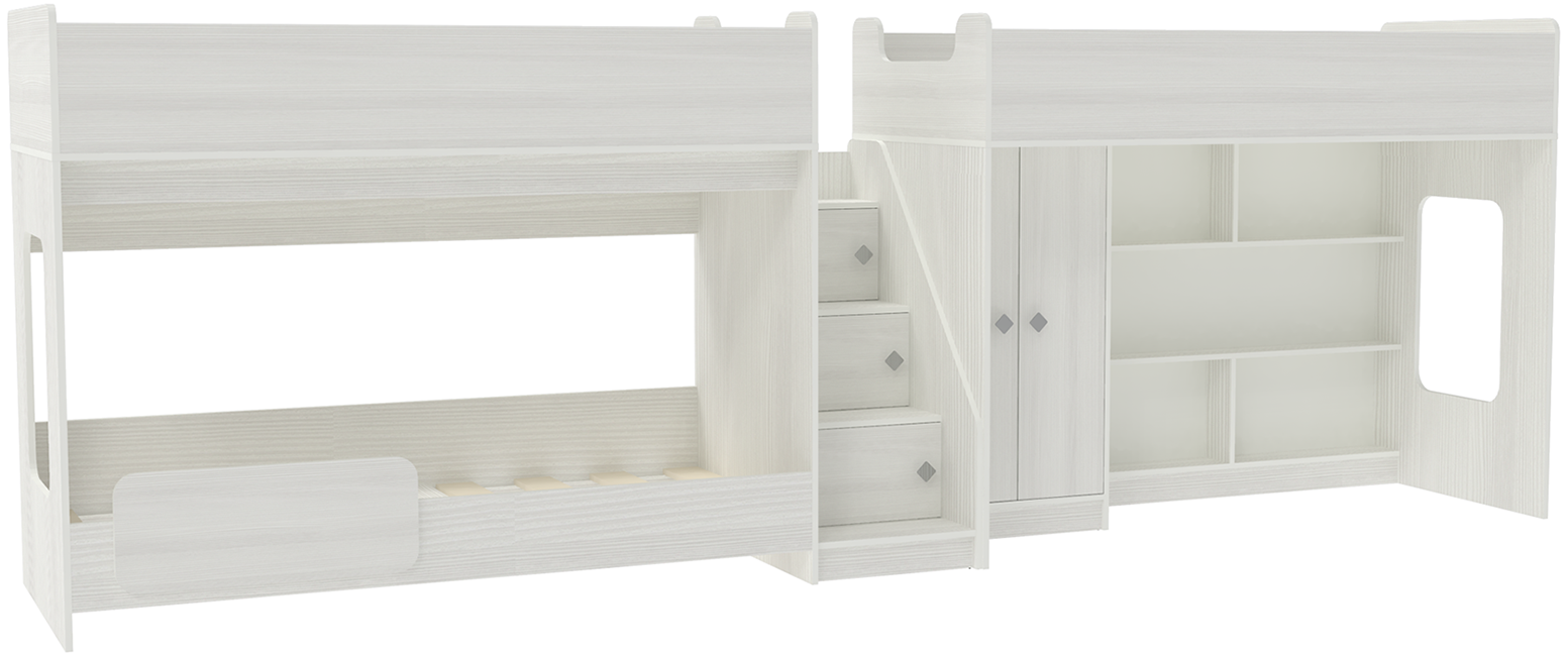 Трехъярусная кровать Л-43.1.5 - решение для троих детей с угловой лестницей. Комплект очень компактный и занимает около 4 метров. В комплект входит: Классическая кровать чердак Л-43.1 с большим спальным местом размером 175х75. Встроенный прямой шкаф для хранения одежды, белья, игрушек или иных вещей. Есть даже небольшая игровая зона для самых маленьких. Двухъярусная кровать Л- 43.4 с двумя параллельными спальными местами размером 175х75. Бортик безопасности Л-03. Световое окно - дополнительное освещение, элемент для игры и возможность родителям наблюдать за ребенком. Угловая лестница средней величины из трех ступенек является связующим звеноми, в то же время, разделяет зоны отдыха детей. Лестница, дополненная фасадами, одновременно выполняет функцию стеллажа. Две кровати, шкаф, игровая зона – одна лестница. Идеальный вариант для троих! Мягкий противоударный кант – дополнительная безопасность для детей. Комплект может быть собран как на левую, так и на правую сторону.Характеристики