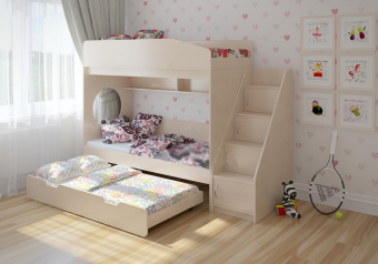 Уникальный комплект Л-10.5 для троих детей! Кроватьзанимает немного места- решение для площади малых габаритов,экономия пространства. Классическая детскаядвухъярусная кроватьс двумя параллельными спальными местами размером1800х800. Третье спальное место 1600х800 выдвижной ярус- представлен большимвыкатным ящиком,спроектированным таким образом,что может быть использован и как ящик дляхранения вещей,и как отдельное спальное место 1600х800! Бортики ящикаспециально сконструированы такой высоты,что легко вмещают в себя матрас,что превращает ящик вполноценное спальное место,которое при необходимостиможно спрятать под кровать. Нижнее спальное место легко выдвигается и задвигается,ребенок сможет управляться с ним.Для данного ящика использованыусиленные колёса, в составе6 колёс и 3 тормоза.Благодаря колёсам ящик удобно выкатывается и закатывается, благодаря тормозам ящик остаётся недвижим, например,во время ночного сна. Под верхним спальным местомрасполагаетсявстроенная двухсекционная полка, в которой удобно хранить книги, учебники, тетради,канцелярию и другие нужные вещи. Световое окно- дополнительное освещение,элемент для игры и возможность родителям наблюдать за ребенком. Угловая лестница-стеллаж из четырех ступенек надёжна и безопасна.В комплект входят фасады,поэтому стеллаж состоит изчетырёх полноценных полок с дверками- удобное дополнительное место для хранения вещей. Мягкий противоударный кант– дополнительная безопасность для детей. Модель универсальна - сторона определяется при сборке. Матрасы в комплект не входят - приобретаются отдельно.Характеристики