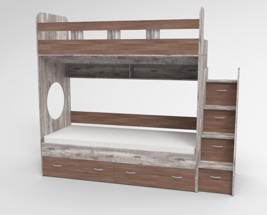 Трехъярусная кровать чердак Юниоррешает проблему малого пространства сочетая в себе целый ряд функций: спальные места для троих, навесная полка для книг и игрушек, вместительный выдвижной ящикпод кроватью может использоваться для хранения или как дополнительное спальное место, а так же приставная лестница расположенная сбоку, обеспечивающая быстрый и безопасный доступ на второй этаж, с безопасными ступенями в виде выдвижных ящиков. Дополнительный бортик для нижнего яруса покупается отдельно!!! Ступеньки лестницы представляют собой небольшие ящички, в которые можно сложить нижнее белье ребенка, игрушки и иные вещи.Уникальность Юниор заключается в: Цене Компактности Безопасности Надёжности Функциональности.Мебель изготовлена из ламинированного ДСП, с использованием кромки АБС, что позволяет продлить срок службы изделия и сохранить внешний вид. Отсутствие острых углов является самым главным критерием травмобезопасности детей. Кровать выполнена из надежной 16мм ламинированной ДСП. Все торцы мебели обрамлены кромкой ABS 1мм. На цветных фасадах светло-бежевая кромка. Сборка универсальная, лестница может быть справа и слева. Спальное место 1900х800мм. Материал – ЛДСП. Мебель соответствует высоким стандартам качества и безопасности. Вся мебель сертифицирована и выполнена из экологически чистого материала. Двухъярусная кровать ЮНИОРявляясь одновременно яркой, функциональной и универсальной мебелью, займет почтенное место в детской. *Предприятие-изготовитель оставляет за собой право вносить изменения в конструкцию изделия с целью улучшения технологических и эксплуатационных свойств мебели. Матрасы для кровати вы можете приобрести отдельно в разделедетских матрасов. Так же мы предлагаем ниже, в разделе Аксессуары, наиболее оптимальные варианты для данной кровати.