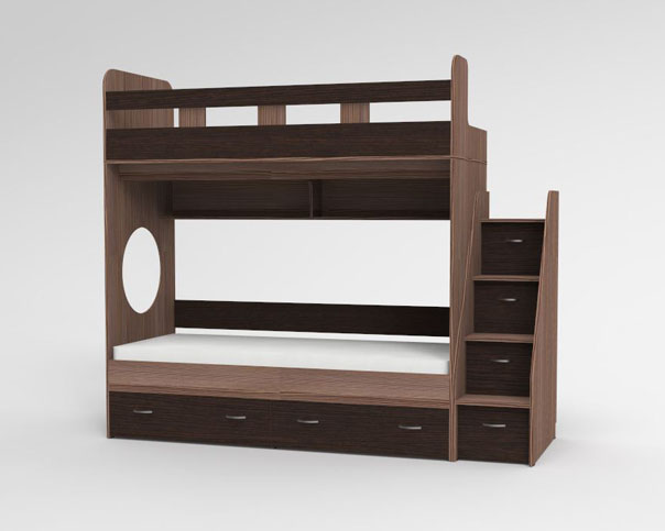Трехъярусная кровать чердак Юниоррешает проблему малого пространства сочетая в себе целый ряд функций: спальные места для троих, навесная полка для книг и игрушек, вместительный выдвижной ящикпод кроватью может использоваться для хранения или как дополнительное спальное место, а так же приставная лестница расположенная сбоку, обеспечивающая быстрый и безопасный доступ на второй этаж, с безопасными ступенями в виде выдвижных ящиков. Дополнительный бортик для нижнего яруса покупается отдельно!!! Ступеньки лестницы представляют собой небольшие ящички, в которые можно сложить нижнее белье ребенка, игрушки и иные вещи.Уникальность Юниор заключается в: Цене Компактности Безопасности Надёжности Функциональности.Мебель изготовлена из ламинированного ДСП, с использованием кромки АБС, что позволяет продлить срок службы изделия и сохранить внешний вид. Отсутствие острых углов является самым главным критерием травмобезопасности детей. Кровать выполнена из надежной 16мм ламинированной ДСП. Все торцы мебели обрамлены кромкой ABS 1мм. На цветных фасадах светло-бежевая кромка. Сборка универсальная, лестница может быть справа и слева. Спальное место 1900х800мм. Материал – ЛДСП. Мебель соответствует высоким стандартам качества и безопасности. Вся мебель сертифицирована и выполнена из экологически чистого материала. Двухъярусная кровать ЮНИОРявляясь одновременно яркой, функциональной и универсальной мебелью, займет почтенное место в детской. *Предприятие-изготовитель оставляет за собой право вносить изменения в конструкцию изделия с целью улучшения технологических и эксплуатационных свойств мебели. Матрасы для кровати вы можете приобрести отдельно в разделедетских матрасов. Так же мы предлагаем ниже, в разделе Аксессуары, наиболее оптимальные варианты для данной кровати.