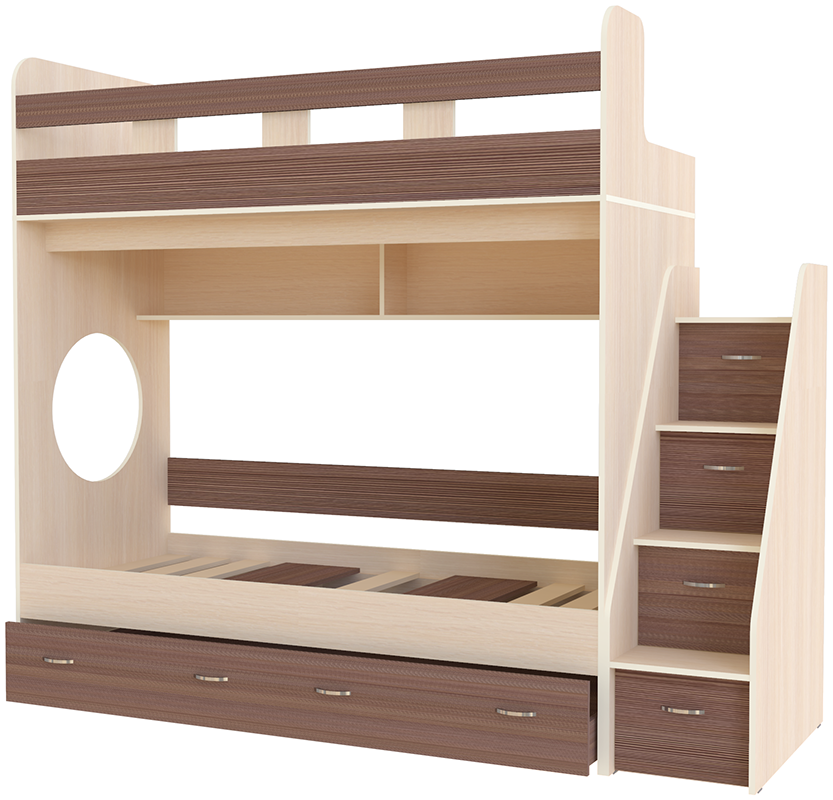 Трехъярусная кровать чердак Юниоррешает проблему малого пространства сочетая в себе целый ряд функций: спальные места для троих, навесная полка для книг и игрушек, вместительный выдвижной ящикпод кроватью может использоваться для хранения или как дополнительное спальное место, а так же приставная лестница расположенная сбоку, обеспечивающая быстрый и безопасный доступ на второй этаж, с безопасными ступенями в виде выдвижных ящиков. Дополнительный бортик для нижнего яруса покупается отдельно!!! Ступеньки лестницы представляют собой небольшие ящички, в которые можно сложить нижнее белье ребенка, игрушки и иные вещи.Уникальность Юниор заключается в: Цене Компактности Безопасности Надёжности Функциональности.Мебель изготовлена из ламинированного ДСП, с использованием кромки АБС, что позволяет продлить срок службы изделия и сохранить внешний вид. Отсутствие острых углов является самым главным критерием травмобезопасности детей. Кровать выполнена из надежной 16мм ламинированной ДСП. Все торцы мебели обрамлены кромкой ABS 1мм. На цветных фасадах светло-бежевая кромка. Сборка универсальная, лестница может быть справа и слева. Спальное место 1900х800мм. Материал – ЛДСП. Мебель соответствует высоким стандартам качества и безопасности. Вся мебель сертифицирована и выполнена из экологически чистого материала. Двухъярусная кровать ЮНИОРявляясь одновременно яркой, функциональной и универсальной мебелью, займет почтенное место в детской. *Предприятие-изготовитель оставляет за собой право вносить изменения в конструкцию изделия с целью улучшения технологических и эксплуатационных свойств мебели. Матрасы для кровати вы можете приобрести отдельно в разделедетских матрасов. Так же мы предлагаем ниже, в разделе Аксессуары, наиболее оптимальные варианты для данной кровати.