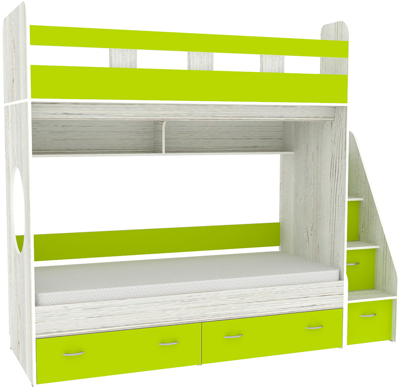 Трехъярусная кровать чердак Юниоррешает проблему малого пространства сочетая в себе целый ряд функций: спальные места для троих, навесная полка для книг и игрушек, вместительный выдвижной ящикпод кроватью может использоваться для хранения или как дополнительное спальное место, а так же приставная лестница расположенная сбоку, обеспечивающая быстрый и безопасный доступ на второй этаж, с безопасными ступенями в виде выдвижных ящиков. Дополнительный бортик для нижнего яруса покупается отдельно!!! Ступеньки лестницы представляют собой небольшие ящички, в которые можно сложить нижнее белье ребенка, игрушки и иные вещи.Уникальность Юниор заключается в: Цене Компактности Безопасности Надёжности Функциональности.Мебель изготовлена из ламинированного ДСП, с использованием кромки АБС, что позволяет продлить срок службы изделия и сохранить внешний вид. Отсутствие острых углов является самым главным критерием травмобезопасности детей. Кровать выполнена из надежной 16мм ламинированной ДСП. Все торцы мебели обрамлены кромкой ABS 1мм. На цветных фасадах светло-бежевая кромка. Сборка универсальная, лестница может быть справа и слева. Спальное место 1900х800мм. Материал – ЛДСП. Мебель соответствует высоким стандартам качества и безопасности. Вся мебель сертифицирована и выполнена из экологически чистого материала. Двухъярусная кровать ЮНИОРявляясь одновременно яркой, функциональной и универсальной мебелью, займет почтенное место в детской. *Предприятие-изготовитель оставляет за собой право вносить изменения в конструкцию изделия с целью улучшения технологических и эксплуатационных свойств мебели. Матрасы для кровати вы можете приобрести отдельно в разделедетских матрасов. Так же мы предлагаем ниже, в разделе Аксессуары, наиболее оптимальные варианты для данной кровати.