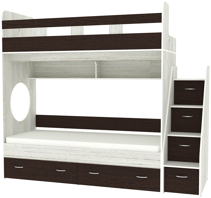 Трехъярусная кровать чердак Юниоррешает проблему малого пространства сочетая в себе целый ряд функций: спальные места для троих, навесная полка для книг и игрушек, вместительный выдвижной ящикпод кроватью может использоваться для хранения или как дополнительное спальное место, а так же приставная лестница расположенная сбоку, обеспечивающая быстрый и безопасный доступ на второй этаж, с безопасными ступенями в виде выдвижных ящиков. Дополнительный бортик для нижнего яруса покупается отдельно!!! Ступеньки лестницы представляют собой небольшие ящички, в которые можно сложить нижнее белье ребенка, игрушки и иные вещи.Уникальность Юниор заключается в: Цене Компактности Безопасности Надёжности Функциональности.Мебель изготовлена из ламинированного ДСП, с использованием кромки АБС, что позволяет продлить срок службы изделия и сохранить внешний вид. Отсутствие острых углов является самым главным критерием травмобезопасности детей. Кровать выполнена из надежной 16мм ламинированной ДСП. Все торцы мебели обрамлены кромкой ABS 1мм. На цветных фасадах светло-бежевая кромка. Сборка универсальная, лестница может быть справа и слева. Спальное место 1900х800мм. Материал – ЛДСП. Мебель соответствует высоким стандартам качества и безопасности. Вся мебель сертифицирована и выполнена из экологически чистого материала. Двухъярусная кровать ЮНИОРявляясь одновременно яркой, функциональной и универсальной мебелью, займет почтенное место в детской. *Предприятие-изготовитель оставляет за собой право вносить изменения в конструкцию изделия с целью улучшения технологических и эксплуатационных свойств мебели. Матрасы для кровати вы можете приобрести отдельно в разделедетских матрасов. Так же мы предлагаем ниже, в разделе Аксессуары, наиболее оптимальные варианты для данной кровати.