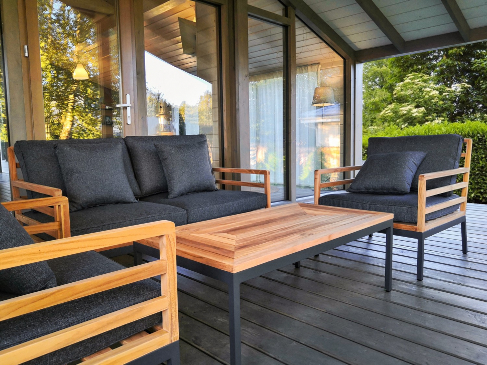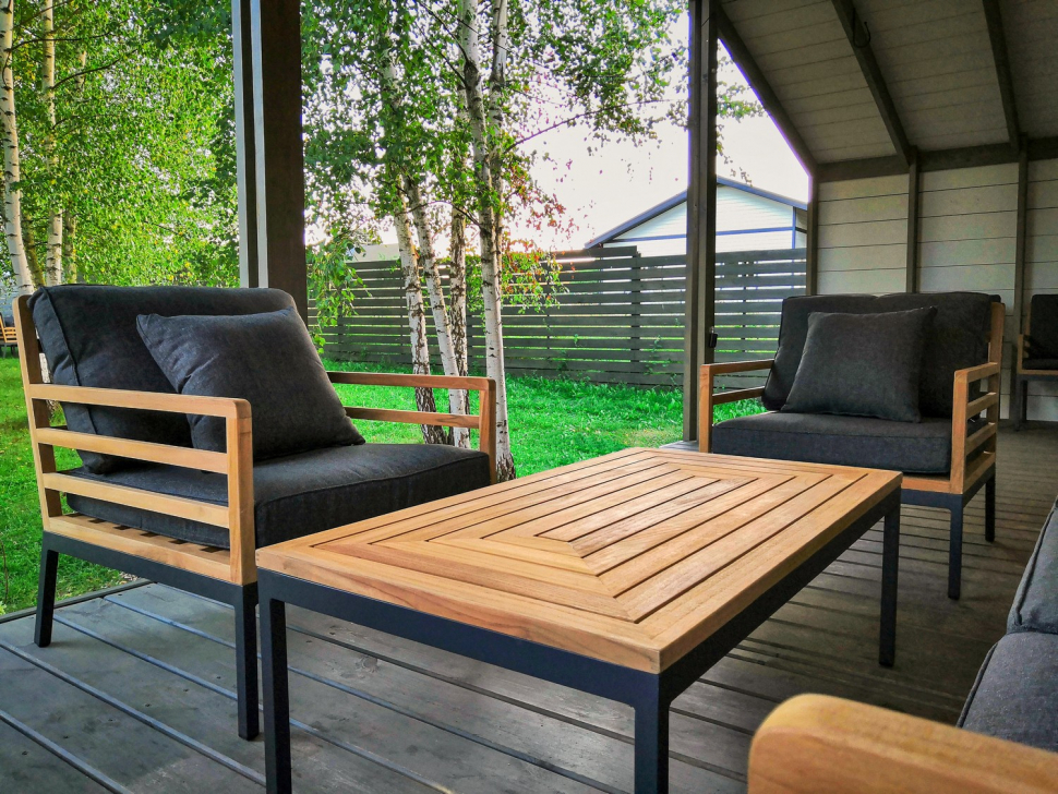 В коллекции гармонично сочетается натуральный цвет тикового дерева и строгие формы подножья из алюминия, окрашенного порошковой краской в благородный серый цвет. Мебель соединяет в себе черты модерна с нотками кантри. Простые и четкие линии мебели создают легкий и в тоже время выразительный образ. Данная лаунж зона состоит из двухместного дивана, двух кресел и журнального столика. Мебель оснащена подушками из премиальной водоотталкивающей ткани серого цвета, который выгодно подчеркивает красоту тикового дерева, чехлы съемные. Ткань, кроме того, что обладает водоотталкивающим эффектом, устойчива к ультрафиолету, т.к. содержит акрил, что дает ей защиту от выгорания при прямом попадании солнечных лучей. В комплекте идут декоративные подушки под спину в цвете основных подушек.