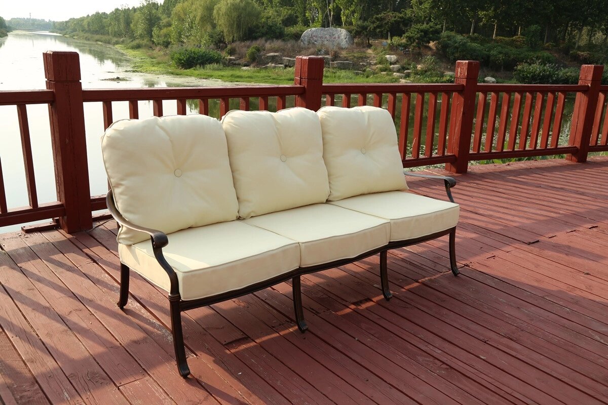 Металлический трехместный диван Madrid из литого алюминия рассчитан на 3 персоны и будет великолепно смотреться как в доме, так и в саду. Алюминиевый сплав этой садовой мебели из металла прочен, легкий и всепогодный. Большие и мягкие подушки (низ+верх) позволяют провести незабываемое время отдыха с книгой или друзьями.