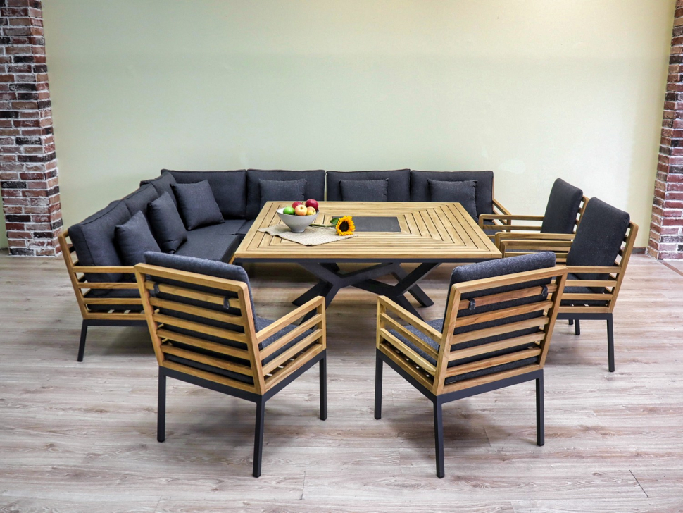 Каркас мебели выполнен из всесезонного алюминия с порошковым покрытием темно-серого цвета, подлокотники и спинки диванов изготовлены из натурального тика, подушки сидений и спинок обшиты премиальной уличной тканью темно-серого цвета с водоотталкивающей пропиткой, толщина подушек 12 см, съемные чехлы на "молнии", столешница обеденного стола изготовлена из натурального тика с керамической вставкой для горячего по центру.