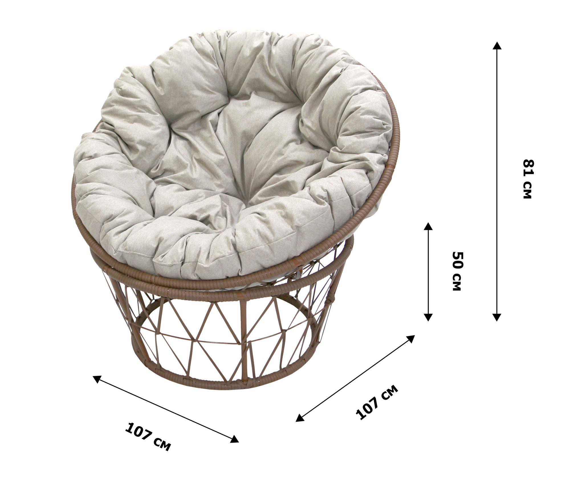 Габариты изделия (Ш/ГхДхВ) : 107х107х81 Количество штук в упаковке : 1 Цвет каркаса : бежевый Материал каркаса : сталь Покрытие : краска порошковая полимерная Цвет чехла мягкого элемента/матраса : бежевый Цвет поверхности : бежевый Материал поверхности : ротанг искусственный Допустимая нагрузка : 120 Требуется сборка : Да Страна производства : РОССИЯ Гарантийный срок : 12 Дополнительно : Кресло под наклоном: высота от пола до верхней точки 81см, высота от пола до сиденья 50см. Чехол не съемный.Характеристики