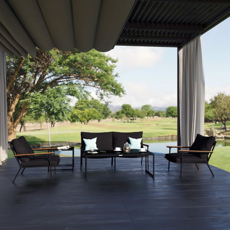 Материалы: всесезонный алюминий с порошковым напылением, специальная ткань для улицы, тик