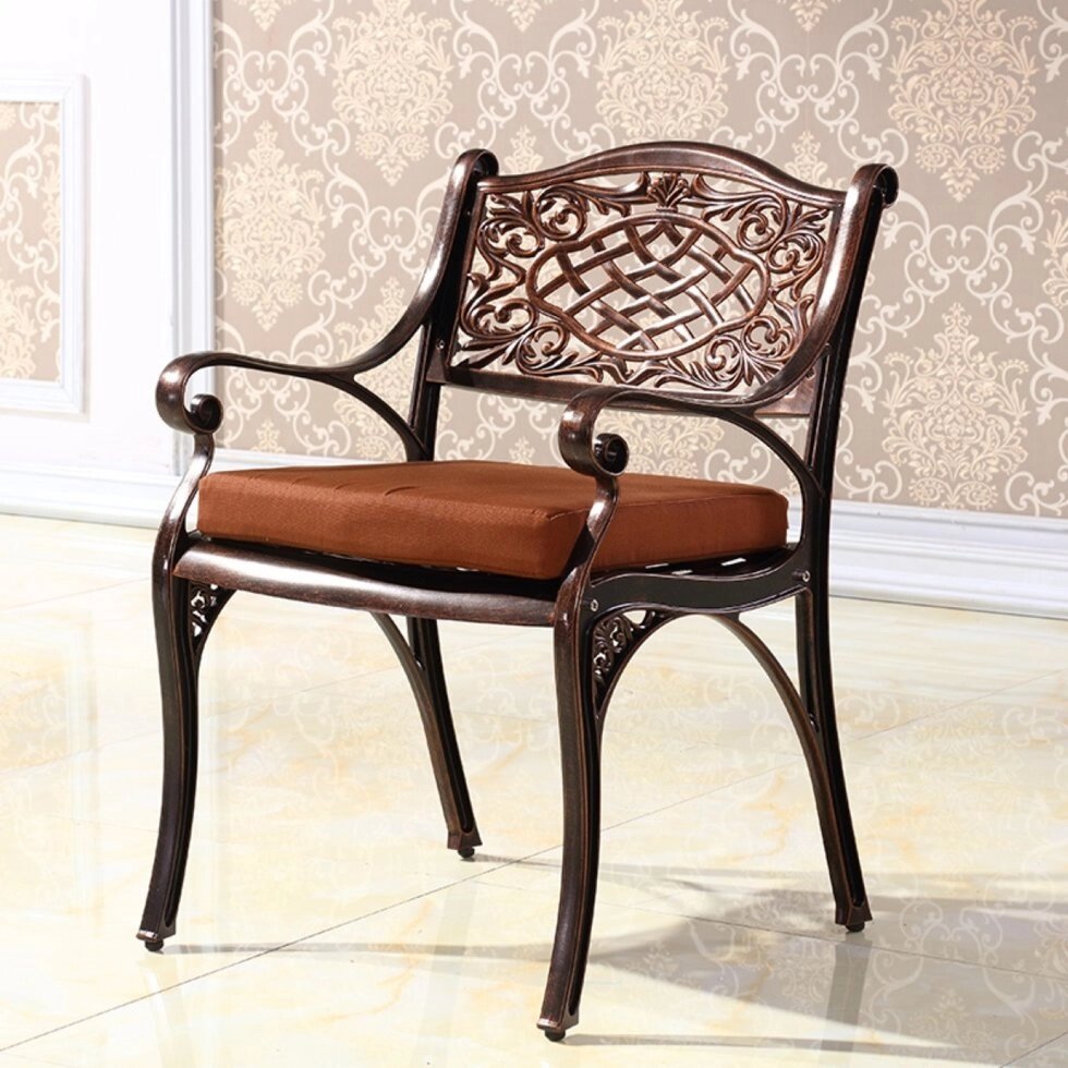 Разборное кресло из литого алюминия можно купить для дома и сада, кафе или ресторана. Такое литое кресло из алюминиевого сплава выполнено в стиле кованой, но на порядок легче и не подвержена коррозии. Кресла из литого алюминия поставляются в разобранном виде БЕЗ ПОДУШЕК по 2 штуки в коробке. Цвет: античная бронза (фото 3 и 4).