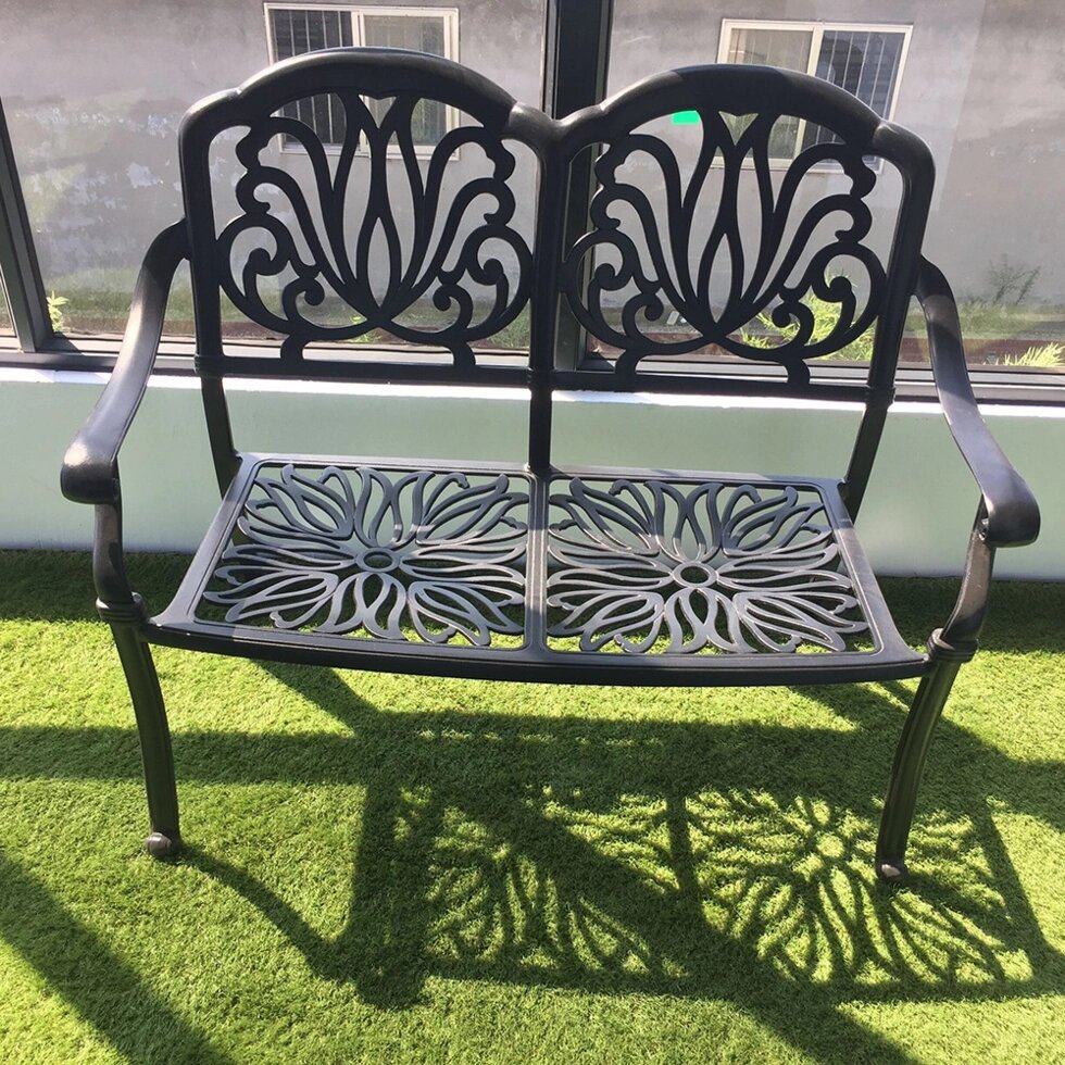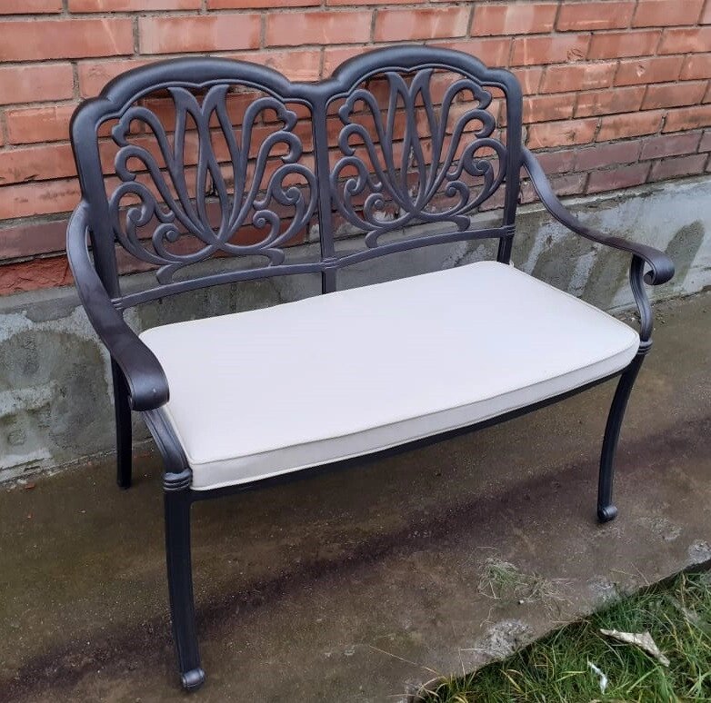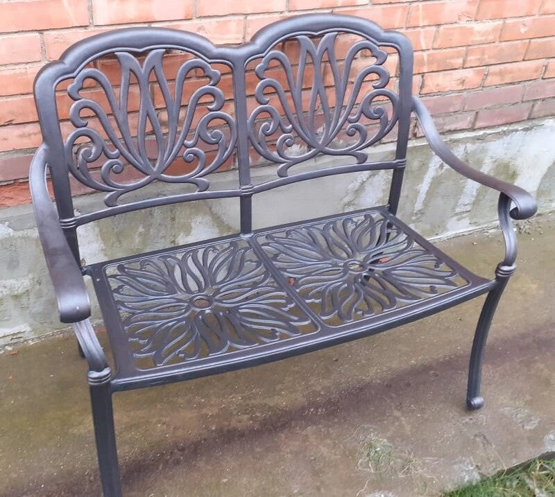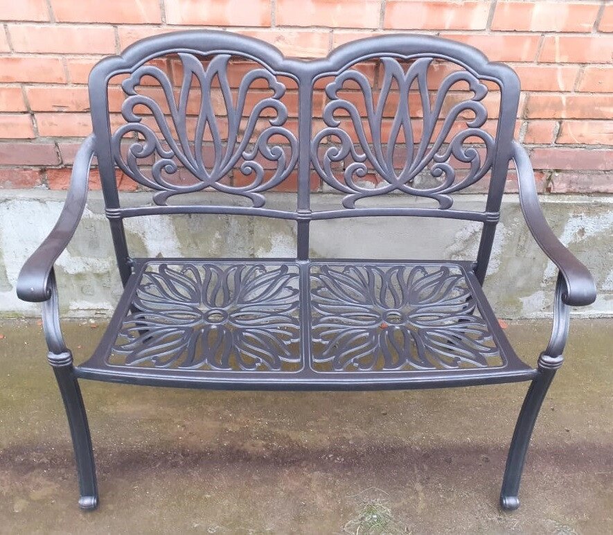 Литая двухместная софа из алюминия выгодно смотрится на террасе, веранде или в беседке. Литой алюминий - это легкий материал, которому не страшны перепады температур и различные погодные осадки, он предназначен для использования на улице или открытых площадках.