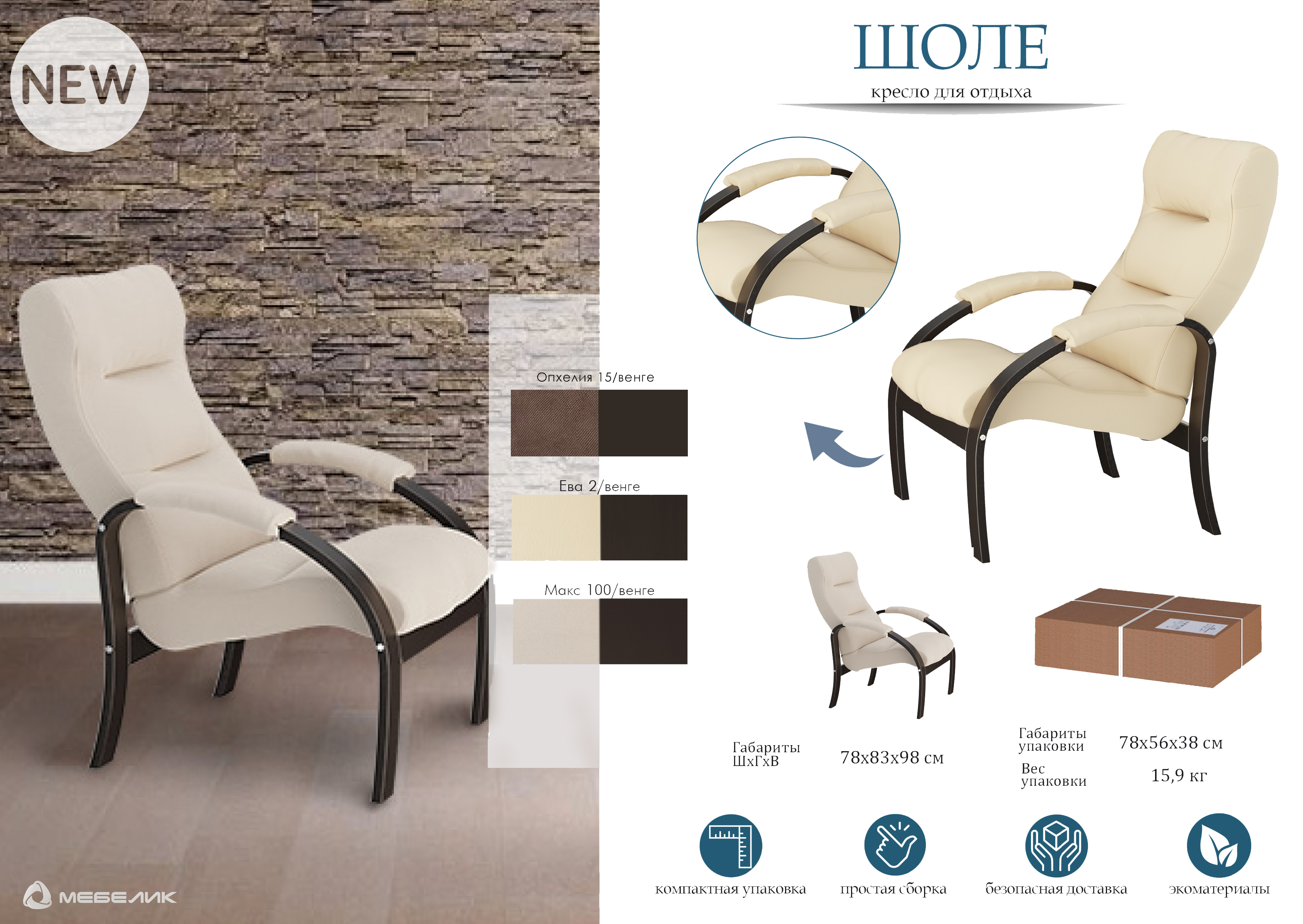 Вы можете купить Кресло для отдыха Мебелик Шоле, Ткань опхелия 15, каркас венге оптом в нашем магазине, предложим цену с оптовой скидкой.