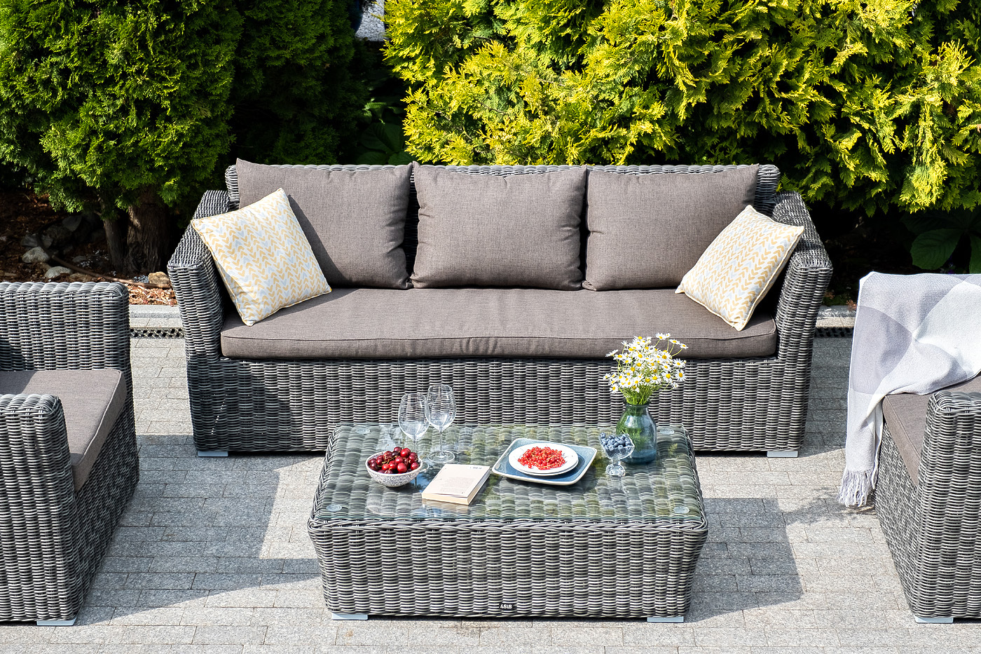 Диван из искусственного ротанга «Капучино» в своей основе имеет каркас из алюминия, который оплетен вручную круглым плетением графитового цвета. Размеры модели: 2220×865×815 мм, которые позволяют разместить трех человек. Подушки, входящие в комплект, выполнены из высококачественного полиэстера с влагоотталкивающей пропиткой.Бренд | 4SIS |