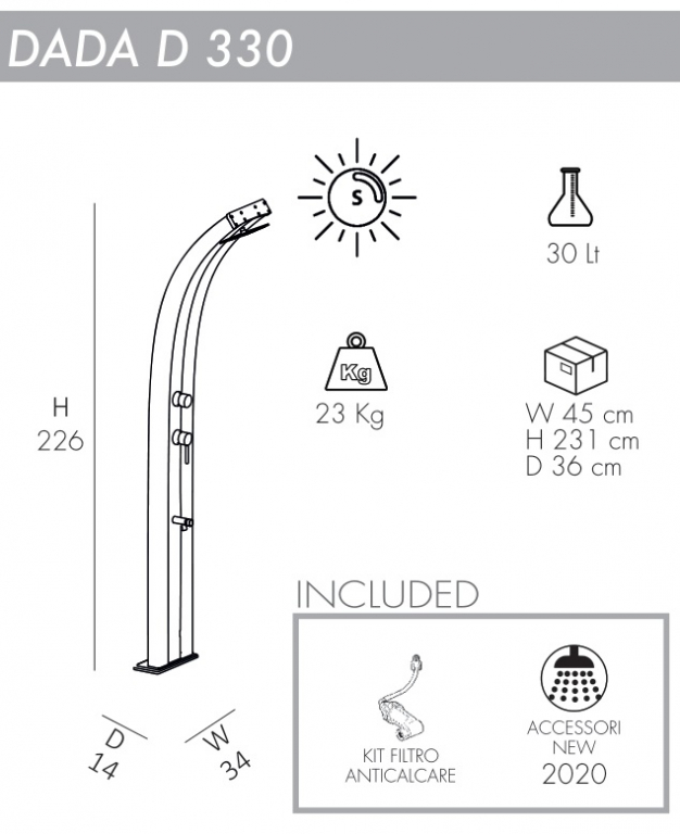 Благодаря современному дизайну серия летних душей Dadaявляется жемчужиной компании Arkema. Душ Dada D330, имеющийкнопку-таймер, разработан специально для общественных мест, где необходимо сократить расход водных ресурсов. В нижней части корпуса душа находится дополнительный кран, который удобно использовать для мытья ног. Такой солнечный душ отлично подходитдля установки на открытом воздухе в гостиницах, спа-салонах, фитнес-центрах, кемпингах, а также туристическихили пляжныхкурортах.Гармония и элегантность его формы делают его подходящим для любой обстановки. Особенности: колонна выполнена изалюминияс порошковым антикоррозийным покрытием, которое обеспечивает долгий срок службы и устойчивость кразличным погодным воздействиям. Также к заказу доступен душ с отделкой из анодированной стали или с полосой из анодированной стали. Цены Вы можете уточнить у наших менеджеров; смеситель горячей воды из бака и холодной воды из источника. Материал - нержавеющая сталь; кнопка-таймер с интервалом подачи воды - 15 сек; душевая насадка "тропический душ"; кран для мытья ног с интервалом подачи воды 15 сек; емкость для воды на 30л; нагрев воды от солнечных лучей; винты для крепления в комплекте; возможность крепления к песку или газону с помощью винта D125 и меламиновой плиты D180 (приобретаются отдельно); фильтр от известкового налета D150 в комплекте; размер входящей трубы для подключения воды 1,27 см; широкая палитра цветов. Скачать инструкцию по установке. Скачать техническую карту. Принцип работы максимально прост, что делает солнечный душ популярным атрибутом пляжныхкурортов. Вода, хранящаяся в корпусе душа, нагревается за счет солнца. Нагретая вода смешивается с холодной водой из источника постоянного водоснабжения (или из садового шланга). После нажатия на кнопку душапроисходит моментальный пуск воды на интервал времени 15 секунд, после чего душ отключается автоматически. Для получения очередной порции воды нужно снова нажать на кнопку. При помощи смесителя возможна регулировка потокагорячей и холодной воды до температуры комфорта. На зимний период воду из внутреннего бака и шлангов необходимо сливать!Характеристики