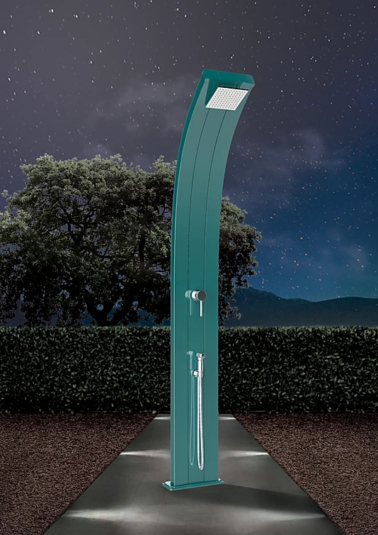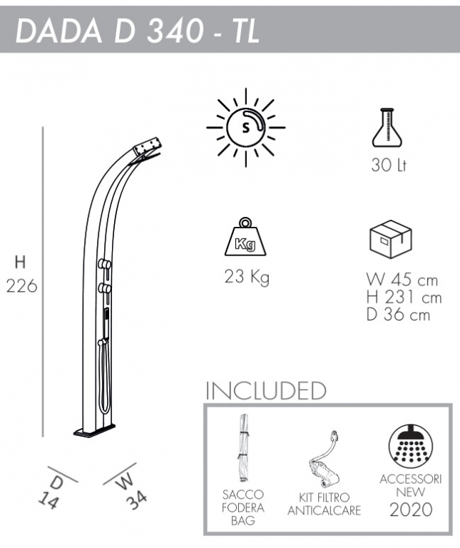 Благодаря современному дизайну серия летних душей Dada является жемчужиной компании Arkema. Инновационный и оригинальный дизайн летнегодушаDada D340-TL, выполненный со специальной отделкой и по технологиям последнего поколения, гарантирует смелую эстетику. Благодаря крупным вложениям, дизайнерскому решению и сложной системе окраски, Arkema создалауникальные уличные душив своем роде, с технологией покраски, используемой в автомобильном секторе.Его цвета - то, что отражает его название. Гармония и элегантность форм душа делают его подходящим для любой обстановки.Солнечный душDada D340-TL подходит для установки на открытом воздухе в гостиницах, кемпингах, туристических или пляжных курортах, или для частного использования. Особенности: колонна выполнена из алюминия с технологией жидкого окрашивания и антикоррозийной обработкой; смеситель горячей воды из бака и холодной воды из источника. Материал - нержавеющая сталь; душевая насадка "тропический душ"; гибкий шланг, благодаря которому удобство в использовании возрастает в несколько раз; дивертор, с помощью которого выполняется перенаправление потока воды между душевой головкой и гибким шлангом; емкость для воды на 30л; нагрев воды от солнечных лучей; устойчивостьк ультрафиолетовым лучам, коррозии, соли и известняку; размер входящей трубы для подключения воды 1,27 см; винты для крепления в комплекте; возможность крепления к песку или газону с помощью винта D125 и меламиновой плиты D180 (приобретаются отдельно); чехол для душа D170 в комплекте; фильтр от известкового налета D150в комплекте; широкая палитра цветов: Standard - сатинированноезолото (1200), жемчужный черный (7300), жемчужный белый (9400), изумрудный (6700), анодированный (9600), а также Special - розовое золото (1100), серебро (1300), сапфир (5600), рубин (3500). Цену за модель, выполненную в расцветке Special, уточняйте у наших менеджеров. Скачать инструкцию по установке. Скачать техническую карту. Принцип работы максимально прост, что делает солнечный душ популярным атрибутом пляжныхкурортов. Вода, хранящаяся в корпусе душа, нагревается за счет солнца. Нагретая вода смешивается с холодной водой из источника постоянного водоснабжения (или из садового шланга). При помощи смесителя возможна регулировка потокагорячей и холодной воды до температуры комфорта. На зимний период воду из внутреннего бака и шлангов необходимо сливать!Характеристики