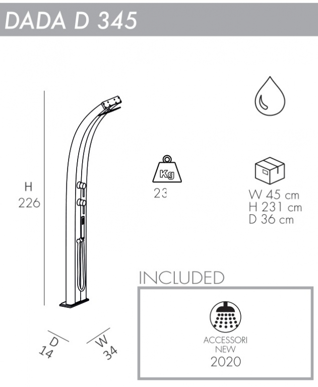 Благодаря своему стильному, функциональному и современному дизайну уличный душ Dada D345является жемчужиной в продукции компании.Онидеально подходит для установки как внутри, так и снаружи помещения, для сада, бассейна илипляжного домика.Чистый дизайн, элегантный и заботливый.Душ оснащен гибким шлангом,благодаря которому удобство в использовании возрастает в несколько раз. Особенности: колонна выполнена изалюминияс порошковым антикоррозийным покрытием, которое обеспечивает долгий срок службы и устойчивость кразличным погодным воздействиям. Также к заказу доступен душ с отделкой из анодированной стали или с полосой из анодированной стали. Цены Вы можете уточнить у наших менеджеров; водоснабжение: горячая и холодная вода; смеситель горячей и холодной воды. Материал - нержавеющая сталь; душевая насадка "тропический душ"; гибкий шланг; дивертор,с помощью которого выполняется перенаправление потока воды между душевой головкой и гибким шлангом; винты для крепления в комплекте; возможность крепления к песку или газону с помощью винта D125 и меламиновой плиты D180 (приобретаются отдельно); фильтр от известкового налета D150 в комплекте; размер входящей трубы для подключения воды 1,27 см; широкая палитра цветов. Скачать инструкцию по установке. Скачать техническую карту.Характеристики