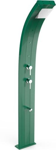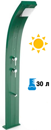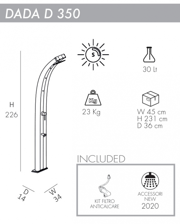 Благодаря своему стильному, функциональному и современному дизайну солнечный душ Dada D350является жемчужиной в продукции компании.Онидеально подходит для установки как внутри, так и снаружи помещения, для сада, бассейна илипляжного домика.Чистый дизайн, элегантный и заботливый.В нижней части корпуса душа находится дополнительный кран, который удобно использовать для мытья ног. Особенности: колонна выполнена изалюминияс порошковым антикоррозийным покрытием, которое обеспечивает долгий срок службы и устойчивость кразличным погодным воздействиям. Также к заказу доступен душ с отделкой из анодированной стали или с полосой из анодированной стали. Цены Вы можете уточнить у наших менеджеров; смеситель горячей воды из бака и холодной воды из источника. Материал - нержавеющая сталь; душевая насадка "тропический душ"; распылители, которыеосвежают и создают очень мелкий туман в жаркое летнее время, значительного охлаждаявоздух; кран для мытья ног с интервалом подачи воды 15 сек; дивертор,с помощью которого выполняется перенаправление потока воды между душевой головкой и краном; емкость для воды на 30л; нагрев воды от солнечных лучей; винты для крепления в комплекте; возможность крепления к песку или газону с помощью винта D125 и меламиновой плиты D180 (приобретаются отдельно); фильтр от известкового налета D150 в комплекте; размер входящей трубы для подключения воды 1,27 см; широкая палитра цветов. Скачать инструкцию по установке. Скачать техническую карту. Принцип работы максимально прост, что делает солнечный душ популярным атрибутом пляжныхкурортов. Вода, хранящаяся в корпусе душа, нагревается за счет солнца. Нагретая вода смешивается с холодной водой из источника постоянного водоснабжения (или из садового шланга). При помощи смесителя возможна регулировка потокагорячей и холодной воды до температуры комфорта. На зимний период воду из внутреннего бака и шлангов необходимо сливать!Характеристики