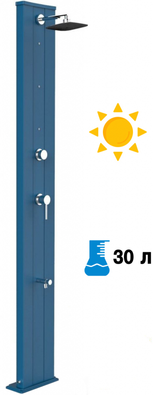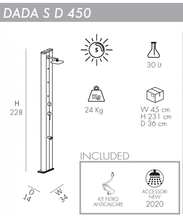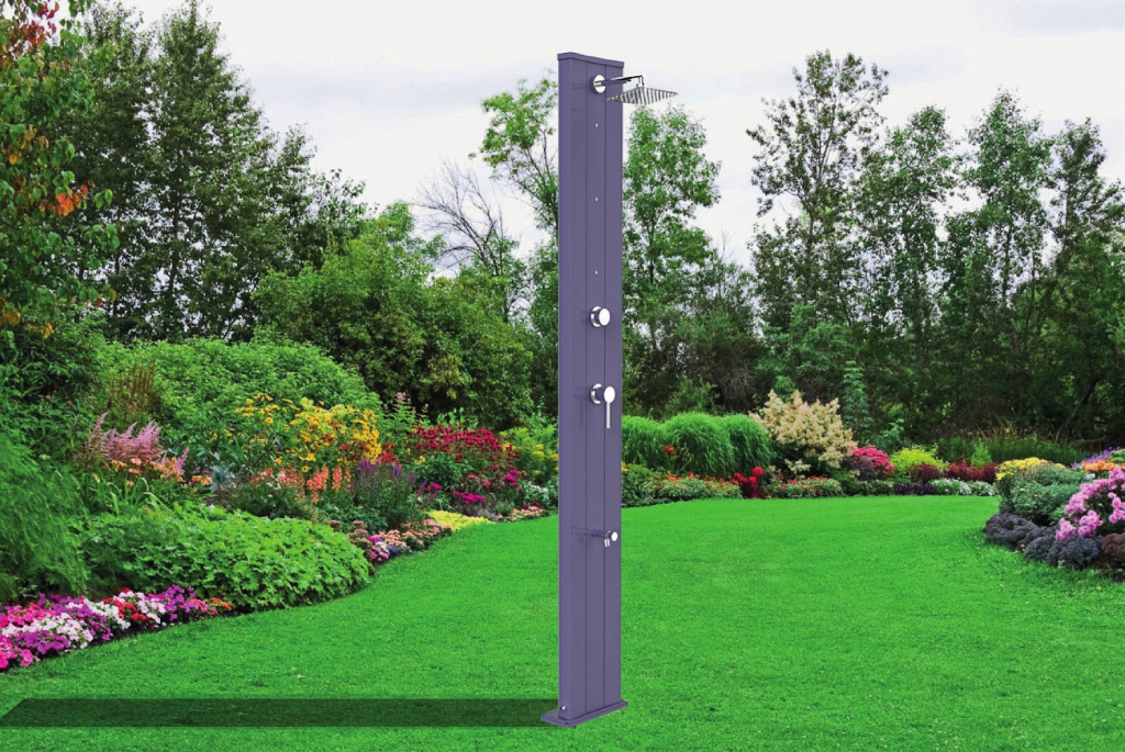 Благодаря своему простому и минималистичному современному дизайну уличный душ Dada Sявляется жемчужиной в продукции компании Arkema.Солнечный душ Dada SD450 подходитдля установки на открытом воздухе в гостиницах, кемпингах, туристическихили пляжныхкурортах,илидля частного использования.Гармония и элегантность его формы делают его подходящим для любой обстановки.В нижней части корпуса душа находится дополнительный кран, который удобно использовать для мытья ног. Особенности: прямая колонна выполнена изалюминияс порошковым антикоррозийным покрытием, которое обеспечивает долгий срок службы и устойчивость кразличным погодным воздействиям. Также к заказу доступен душ с отделкой из анодированной стали или с полосой из анодированной стали. Цены Вы можете уточнить у наших менеджеров; смеситель горячей воды из бака и холодной воды из источника. Материал - нержавеющая сталь; душевая насадка "тропический душ"; распылители, которыеосвежают и создают очень мелкий туман в жаркое летнее время, значительного охлаждаявоздух; кран для мытья ног с интервалом подачи воды 15 сек; дивертор,с помощью которого выполняется перенаправление потока воды между душевой головкой и краном; емкость для воды на 30л; нагрев воды от солнечных лучей; винты для крепления в комплекте; возможность крепления к песку или газону с помощью винта D125 и меламиновой плиты D180 (приобретаются отдельно); фильтр от известкового налета D150 в комплекте; размер входящей трубы для подключения воды 1,27 см; широкая палитра цветов. Скачать инструкцию по установке. Скачать техническую карту. Принцип работы максимально прост, что делает солнечный душ популярным атрибутом пляжныхкурортов. Вода, хранящаяся в корпусе душа, нагревается за счет солнца. Нагретая вода смешивается с холодной водой из источника постоянного водоснабжения (или из садового шланга). При помощи смесителя возможна регулировка потокагорячей и холодной воды до температуры комфорта. На зимний период воду из внутреннего бака и шлангов необходимо сливать!Характеристики
