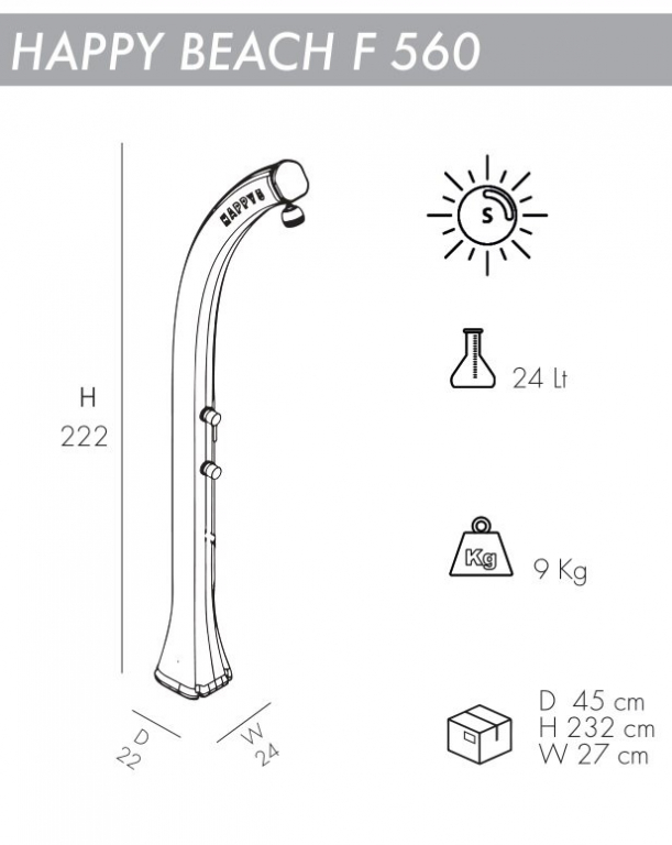 Уникальный дизайн летнего душа Happy Beach F560 с нагревом воды от солнца сочетает в себе стиль и функциональность, простоту и изысканность. Душ Happy Beach F560, имеющий кнопку-таймер, разработан специально для общественных мест, где необходимо сократить расход водных ресурсов. Такой солнечный душ отлично подходит для установки на открытом воздухе в гостиницах, спа-салонах, фитнес-центрах, кемпингах, а также туристических или пляжных курортах.