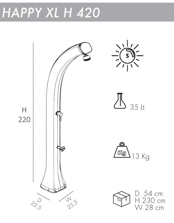 Дизайн летнего душа Happy XL H420 с нагревом воды от солнца сочетает в себе простоту и минималистичность. В нижней части корпуса душа находится дополнительный кран, который удобно использовать для мытья ног. Солнечный душ Happy XL H420 подходит для установки на открытом воздухе в гостиницах, кемпингах, туристических или пляжных курортах, или для частного использования.