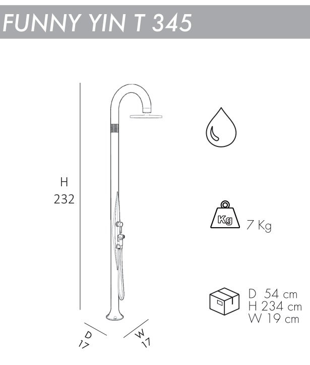 Уличный душ Funny Yin T345 с инновационным и оригинальным дизайном идеально подходит для установки как внутри, так и снаружи помещения, для сада, бассейна или пляжного домика. Чистый дизайн, элегантный и заботливый. Это просто, весело, современно. Его цвета - то, что отражает его название. Проект данных душей выполнен Giancarlo Rusconi, чье имя является синонимом качества и внимания к дизайну и имеет свою подпись в металлическом кольце в верхней части душа. Душ оснащен гибким шлангом, благодаря которому удобство в использовании возрастает в несколько раз.