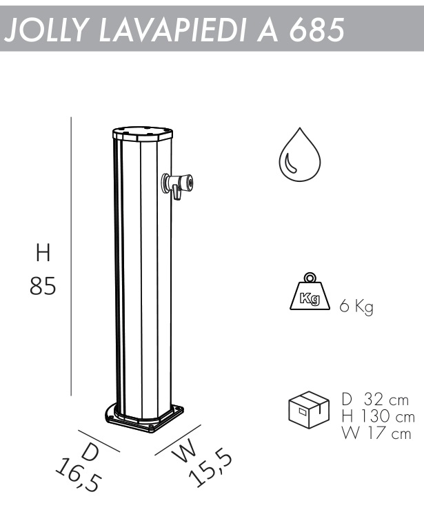 Благодаря своему небольшим размерам и простому управлению душ для ног Jolly Lavapiedi A685 подходит для установки на открытом воздухе в гостиницах, кемпингах, туристических или пляжных курортах, или для частного использования. Душ оснащен краном для мытья ног, благодаря которому удобство в использовании возрастает в несколько раз.