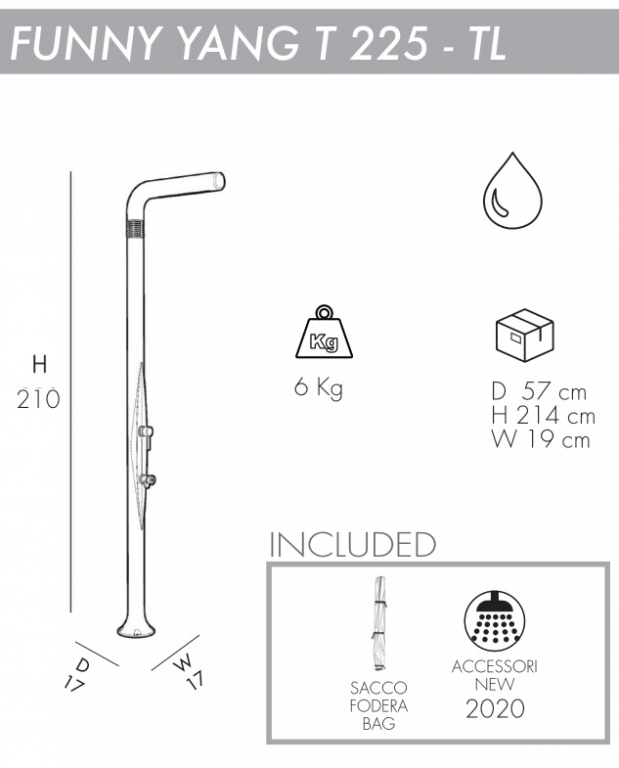 Уличный душFunny Yang T225-TLс инновационным и оригинальным дизайном, выполненный со специальной отделкой и по технологиям последнего поколения, гарантирует смелую эстетику. Благодаря крупным вложениям, дизайнерскому решению и сложной системе окраски, Arkema создалауникальные уличные душив своем роде, с технологией покраски, используемой в автомобильном секторе.Его цвета - то, что отражает его название. Гармония и элегантность форм душа делают его подходящим для любой обстановки, для сада, бассейна или интерьера. Проект данных душейвыполнен Giancarlo Rusconi, чье имя являетсясинонимомкачества и внимания к дизайну и имеет свою подпись в металлическом кольце в верхней части душа.В нижней части корпуса душа находится дополнительный кран, который удобно использовать для мытья ног. Особенности: колонна выполнена изполиэтилена высокой плотности (ПНД) с технологией жидкого и напоминающего металл окрашивания и антикоррозийной обработкой; водоснабжение: горячая и холодная вода; смеситель горячей и холодной воды. Материал - нержавеющая сталь; душевая насадка "тропический душ"; кран для мытья ног; устойчивостьк ультрафиолетовым лучам, коррозии, соли и известняку; размер входящей трубы для подключения воды 1,27 см; винты для крепления в комплекте; возможность крепления к песку или газону с помощью винта D125 и меламиновой плиты D180 (приобретаются отдельно); чехол для душа D170 в комплекте; широкая палитра цветов: Standard - сатинированноезолото (1200), жемчужный черный (7300), жемчужный белый (9400), изумрудный (6700), а также Special - розовое золото (1100), серебро (1300), сапфир (5600), рубин (3500). Цену за модель, выполненную в расцветке Special, уточняйте у наших менеджеров. Скачать инструкцию по установке. Скачать техническую карту.Характеристики