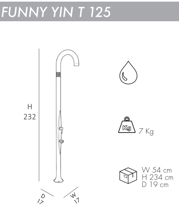 Уличный душFunny Yin T125 с инновационным и оригинальным дизайномидеально подходит для установки как внутри, так и снаружи помещения, для сада, бассейна илипляжного домика.Чистый дизайн, элегантный и заботливый. Это просто, весело, современно. Его цвета - то, что отражает его название. Проект данных душейвыполнен Giancarlo Rusconi, чье имя является синонимомкачества и внимания к дизайну и имеет свою подпись в металлическом кольце в верхней части душа.В нижней части корпуса душа находится дополнительный кран, который удобно использовать для мытья ног. Особенности: колонна выполнена изполиэтилена высокой плотности (ПНД), который обладает устойчивостью к ультрафиолетовым лучам, коррозии, соли и известняку; водоснабжение: горячая и холодная вода; смеситель горячей и холодной воды. Материал - нержавеющая сталь; душевая насадка; кран для мытья ног; устойчивость к УФ, соли и накипи; винты для крепления в комплекте; возможность крепления к песку или газону с помощью винта D125 и меламиновой плиты D180 (приобретаются отдельно); размер входящей трубы для подключения воды 1,27 см; широкая палитра цветов. Скачать инструкцию по установке. Скачать техническую карту.Характеристики