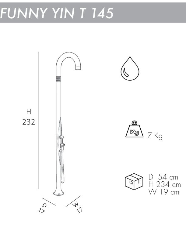 Уличный душFunny Yin T145 с инновационным и оригинальным дизайномидеально подходит для установки как внутри, так и снаружи помещения, для сада, бассейна илипляжного домика.Чистый дизайн, элегантный и заботливый. Это просто, весело, современно. Его цвета - то, что отражает его название. Проект данных душейвыполнен Giancarlo Rusconi, чье имя являетсясинонимом качества и внимания к дизайну и имеет свою подпись в металлическом кольце в верхней части душа.Душ оснащен гибким шлангом,благодаря которому удобство в использовании возрастает в несколько раз. Особенности: колонна выполнена изполиэтилена высокой плотности (ПНД), который обладает устойчивостью к ультрафиолетовым лучам, коррозии, соли и известняку; водоснабжение: горячая и холодная вода; смеситель горячей и холодной воды. Материал - нержавеющая сталь; душевая насадка; гибкий шланг; устойчивость к УФ, соли и накипи; винты для крепления в комплекте; возможность крепления к песку или газону с помощью винта D125 и меламиновой плиты D180 (приобретаются отдельно); размер входящей трубы для подключения воды 1,27 см; широкая палитра цветов. Скачать инструкцию по установке. Скачать техническую карту.Характеристики