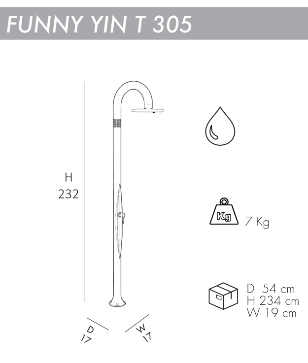 Уличный душFunny Yin T305 с инновационным и оригинальным дизайномидеально подходит для установки как внутри, так и снаружи помещения, для сада, бассейна илипляжного домика.Чистый дизайн, элегантный и заботливый. Это просто, весело, современно. Его цвета - то, что отражает его название. Проект данных душейвыполнен Giancarlo Rusconi, чье имя является синонимомкачества и внимания к дизайну и имеет свою подпись в металлическом кольце в верхней части душа. Особенности: колонна выполнена изполиэтилена высокой плотности (ПНД), который обладает устойчивостью к ультрафиолетовым лучам, коррозии, соли и известняку; водоснабжение: горячая и холодная вода; смеситель горячей и холодной воды. Материал - нержавеющая сталь; душевая насадка диаметром 250 мм; устойчивость к УФ, соли и накипи; винты для крепления в комплекте; возможность крепления к песку или газону с помощью винта D125 и меламиновой плиты D180 (приобретаются отдельно); размер входящей трубы для подключения воды 1,27 см; широкая палитра цветов. Скачать инструкцию по установке. Скачать техническую карту.Характеристики