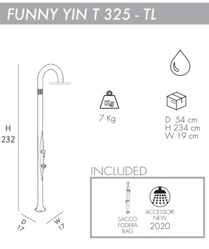 Уличный душFunny Yin T325-TLс инновационным и оригинальным дизайном, выполненный со специальной отделкой и по технологиям последнего поколения, гарантирует смелую эстетику. Благодаря крупным вложениям, дизайнерскому решению и сложной системе окраски, Arkema создалауникальные уличные душив своем роде, с технологией покраски, используемой в автомобильном секторе.Его цвета - то, что отражает его название. Гармония и элегантность форм душа делают его подходящим для любой обстановки, для сада, бассейна или интерьера. Проект данных душейвыполнен Giancarlo Rusconi, чье имя являетсясинонимомкачества и внимания к дизайну и имеет свою подпись в металлическом кольце в верхней части душа.В нижней части корпуса душа находится дополнительный кран, который удобно использовать для мытья ног. Особенности: колонна выполнена изполиэтилена высокой плотности (ПНД) с технологией жидкого и напоминающего металл окрашивания и антикоррозийной обработкой; водоснабжение: горячая и холодная вода; смеситель горячей и холодной воды. Материал - нержавеющая сталь; душевая насадка "тропический душ" диаметром 250 мм; кран для мытья ног; устойчивостьк ультрафиолетовым лучам, коррозии, соли и известняку; винты для крепления в комплекте; возможность крепления к песку или газону с помощью винта D125 и меламиновой плиты D180 (приобретаются отдельно); чехол для душа D170 в комплекте; размер входящей трубы для подключения воды 1,27 см; широкая палитра цветов: Standard - сатинированноезолото, жемчужный черный, жемчужный белый, изумрудный, а также Special - розовое золото, серебро, сапфир, золотой Ван Гог. Цену за модель, выполненную в расцветке Special, уточняйте у наших менеджеров. Скачать инструкцию по установке. Скачать техническую карту.Характеристики