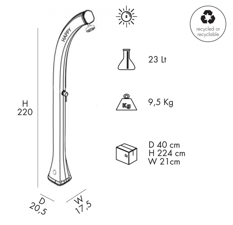 Благодаря своему инновационному и оригинальному дизайну уличный душ Happyидеально подходит для сада, бассейна, пляжного домика или пристани для яхт.Уличный душ Happyвыполнен из полиэтилена.Данная версия полиэтилена обладает устойчивостью к ультрафиолетовым лучам,коррозии в агрессивных средах, соли и известняку.Душ особенно подходит для использования на открытом воздухе.Установка выполняется без проблем, простое подключение к любому садовому шлангу или постоянномуводоснабжению. Особенности: колонна выполнена изполиэтилена высокой плотности (ПНД), который обладает устойчивостью к ультрафиолетовым лучам, коррозии, соли и известняку; встроенный предохранительный клапан; смеситель горячей воды из бака и холодной воды из источника. Материал - нержавеющая сталь; душевая насадка; ёмкость на 23л; нагрев воды от солнечных лучей; винты для крепления в комплекте; размер входящей трубы для подключения воды 1,27 см; возможность крепления к песку или газону с помощью винта D125 и меламиновой плиты D180 (приобретаются отдельно); возможность антивандального крепления с помощью кронштейнаD120 (приобретается отдельно); устойчивость к УФ, соли и накипи; широкая палитра цветов. Скачать инструкцию по установке. Скачать техническую карту. Принцип работы максимально прост, что делает солнечный душ популярным атрибутом пляжныхкурортов. Вода, хранящаяся в корпусе душа, нагревается за счет солнца. Нагретая вода смешивается с холодной водой из источника постоянного водоснабжения (или из садового шланга). При помощи смесителя возможна регулировка потокагорячей и холодной воды до температуры комфорта. На зимний период воду из внутреннего бака и шлангов необходимо сливать!Характеристики