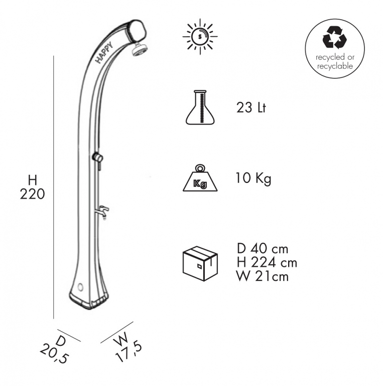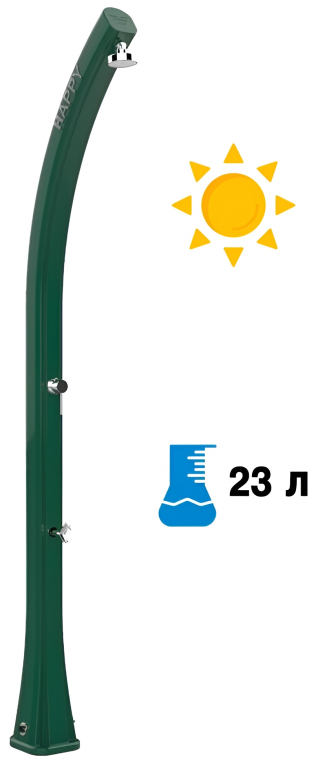 Благодаря своему инновационному и оригинальному дизайну уличный душ Happyидеально подходит для сада, бассейна, пляжного домика или пристани для яхт.Уличный душ Happyвыполнен из полиэтилена. Данная версия полиэтилена обладает устойчивостью к ультрафиолетовым лучам,коррозии в агрессивных средах, соли и известняку. Душ особенно подходит для использования на открытом воздухе. Установка выполняется без проблем, простое подключение к любому садовому шлангу или постоянномуводоснабжению. Особенности: колонна выполнена изполиэтилена высокой плотности (ПНД), который обладает устойчивостью к ультрафиолетовым лучам, коррозии, соли и известняку; встроенный предохранительный клапан; смеситель горячей воды из бака и холодной воды из источника. Материал - нержавеющая сталь; душевая насадка; кран для мытья ног; ёмкость на 25 л; нагрев воды от солнечных лучей; винты для крепления в комплекте; размер входящей трубы для подключения воды 1,27 см; возможность крепления к песку или газону с помощью винта D125 и меламиновой плиты D180 (приобретаются отдельно); возможность антивандального крепления с помощью кронштейнаD120 (приобретается отдельно); устойчивость к УФ, соли и накипи; широкая палитра цветов. Скачать инструкцию по установке. Скачать техническую карту. Принцип работы максимально прост, что делает солнечный душ популярным атрибутом пляжныхкурортов. Вода, хранящаяся в корпусе душа, нагревается за счет солнца. Нагретая вода смешивается с холодной водой из источника постоянного водоснабжения (или из садового шланга). При помощи смесителя возможна регулировка потокагорячей и холодной воды до температуры комфорта. На зимний период воду из внутреннего бака и шлангов необходимо сливать!Характеристики