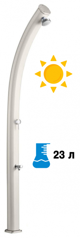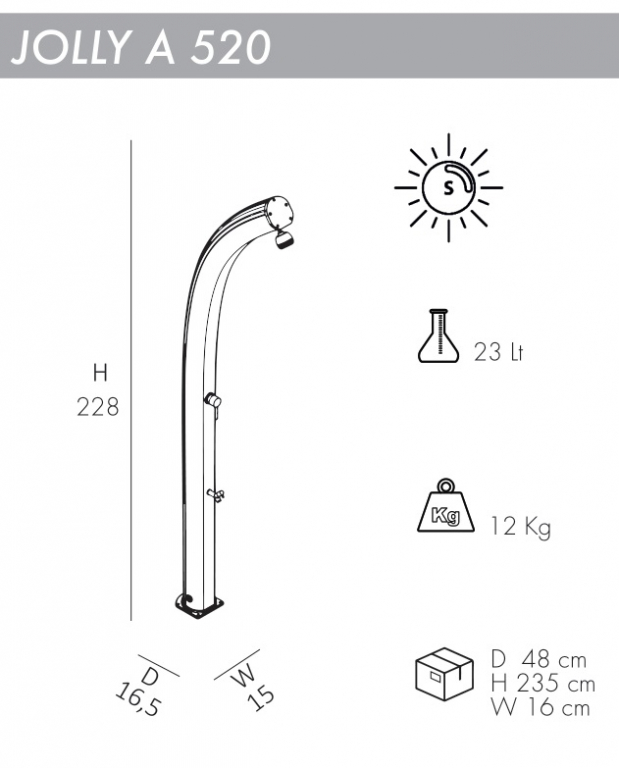 Дизайн летнегодуша JollyA520с нагревом воды от солнца сочетает в себе стиль и функциональность, простоту и изысканность. Солнечный душ JollyA520 подходитдля установки на открытом воздухе в гостиницах, кемпингах, туристическихили пляжныхкурортах,илидля частного использования.В нижней части корпуса душа находится дополнительный кран, который удобно использовать для мытья ног. Особенности: колонна выполнена изалюминияс порошковым антикоррозийным покрытием, которое обеспечивает долгий срок службы и устойчивость кразличным погодным воздействиям. Также к заказу доступен душ с отделкой из нержавеющей стали. Цены Вы можете уточнить у наших менеджеров; смеситель горячей воды из бака и холодной воды из источника. Материал - нержавеющая сталь; душевая насадка; кран для мытья ног; емкость для воды на 23л; нагрев воды от солнечных лучей; винты для крепления в комплекте; возможность крепления к песку или газону с помощью винта D125 и меламиновой плиты D180 (приобретаются отдельно); возможность антивандального крепления с помощью кронштейнаD120 (приобретается отдельно); дополнительно для алюминиевых душей Arkema доступен фильтр от известкового налета D150 (приобретается отдельно); размер входящей трубы для подключения воды 1,27 см; широкая палитра цветов. Скачать инструкцию по установке. Скачать техническую карту. Принцип работы максимально прост, что делает солнечный душ популярным атрибутом пляжныхкурортов. Вода, хранящаяся в корпусе душа, нагревается за счет солнца. Нагретая вода смешивается с холодной водой из источника постоянного водоснабжения (или из садового шланга). При помощи смесителя возможна регулировка потокагорячей и холодной воды до температуры комфорта. На зимний период воду из внутреннего бака и шлангов необходимо сливать!Характеристики