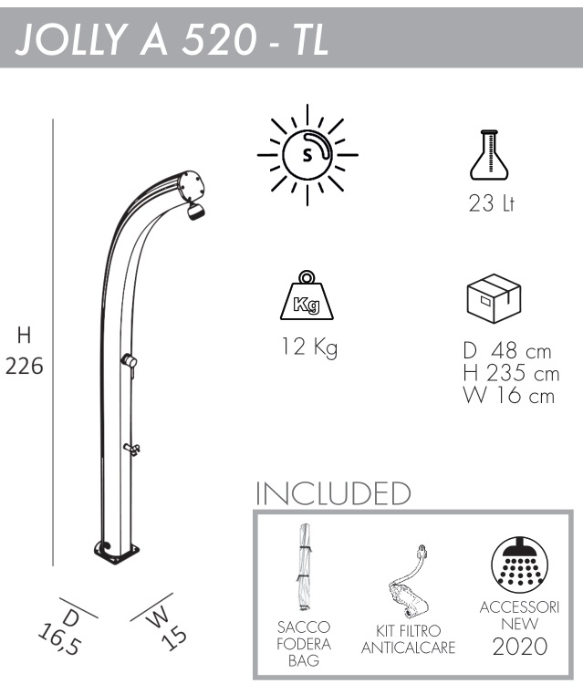 ИнновационныйиоригинальныйдизайнлетнегодушаJolly A520-TLс нагревом воды от солнца, выполненный со специальной отделкой и по технологиям последнего поколения, гарантирует смелую эстетику. Благодаря крупным вложениям, дизайнерскому решению и сложной системе окраски, Arkema создалауникальные уличные душив своем роде, с технологией покраски, используемой в автомобильном секторе.Его цвета - то, что отражает его название. Гармония и элегантность форм душа делают его подходящим для любой обстановки.Солнечный душ Jolly A520-TL подходитдля установки на открытом воздухе в гостиницах, кемпингах, туристическихили пляжных курортах,илидля частного использования.В нижней части корпуса душа находится дополнительный кран, который удобно использовать для мытья ног. Особенности: колонна выполнена из алюминия с технологией жидкого окрашивания и антикоррозийной обработкой; смеситель горячей воды из бака и холодной воды из источника. Материал - нержавеющая сталь; душевая насадка "тропический душ"; кран для мытья ног; емкость для воды на 23л; нагрев воды от солнечных лучей; устойчивостьк ультрафиолетовым лучам, коррозии, соли и известняку; винты для крепления в комплекте; размер входящей трубы для подключения воды 1,27 см; возможность крепления к песку или газону с помощью винта D125 и меламиновой плиты D180 (приобретаются отдельно); возможность антивандального крепления с помощью кронштейна D120 (приобретается отдельно); чехол для душа D170 в комплекте; фильтр от известкового налета D150в комплекте; широкая палитра цветов: Standard - сатинированное золото (1200), жемчужный черный (7300), жемчужный белый (9400), изумрудный (6700), а также Special - розовое золото (1100), серебро (1300), сапфир (5600), рубин (3500). Цену за модель, выполненную в расцветке Special, уточняйте у наших менеджеров. Скачать инструкцию по установке. Скачать техническую карту. Принцип работы максимально прост, что делает солнечный душ популярным атрибутом пляжныхкурортов. Вода, хранящаяся в корпусе душа, нагревается за счет солнца. Нагретая вода смешивается с холодной водой из источника постоянного водоснабжения (или из садового шланга). При помощи смесителя возможна регулировка потокагорячей и холодной воды до температуры комфорта. На зимний период воду из внутреннего бака и шлангов необходимо сливать!Характеристики
