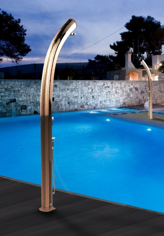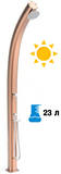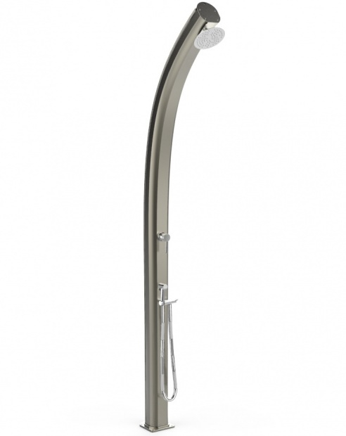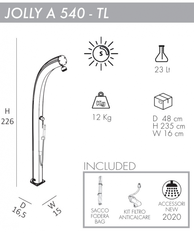 ИнновационныйиоригинальныйдизайнлетнегодушаJolly A540-TLс нагревом воды от солнца, выполненный со специальной отделкой и по технологиям последнего поколения, гарантирует смелую эстетику. Благодаря крупным вложениям, дизайнерскому решению и сложной системе окраски, Arkema создалауникальные уличные душив своем роде, с технологией покраски, используемой в автомобильном секторе.Его цвета - то, что отражает его название. Гармония и элегантность форм душа делают его подходящим для любой обстановки.Солнечный душ Jolly Plus B540-TL подходитдля установки на открытом воздухе в гостиницах, кемпингах, туристическихили пляжных курортах,илидля частного использования. Особенности: колонна выполнена из алюминия с технологией жидкого окрашивания и антикоррозийной обработкой; смеситель горячей воды из бака и холодной воды из источника. Материал - нержавеющая сталь; душевая насадка "тропический душ"; гибкий шланг, благодаря которому удобство в использовании возрастает в несколько раз; емкость для воды на 23л; нагрев воды от солнечных лучей; устойчивостьк ультрафиолетовым лучам, коррозии, соли и известняку; размер входящей трубы для подключения воды 1,27 см; винты для крепления в комплекте; возможность крепления к песку или газону с помощью винта D125 и меламиновой плиты D180 (приобретаются отдельно); возможность антивандального крепления с помощью кронштейна D120 (приобретается отдельно); чехол для душа D170 в комплекте; фильтр от известкового налета D150в комплекте; широкая палитра цветов: Standard - сатинированное золото (1200), жемчужный черный (7300), жемчужный белый (9400), изумрудный (6700), а также Special - розовое золото (1100), серебро (1300), сапфир (5600), рубин (3500). Цену за модель, выполненную в расцветке Special, уточняйте у наших менеджеров. Скачать инструкцию по установке. Скачать техническую карту. Принцип работы максимально прост, что делает солнечный душ популярным атрибутом пляжныхкурортов. Вода, хранящаяся в корпусе душа, нагревается за счет солнца. Нагретая вода смешивается с холодной водой из источника постоянного водоснабжения (или из садового шланга). При помощи смесителя возможна регулировка потокагорячей и холодной воды до температуры комфорта. На зимний период воду из внутреннего бака и шлангов необходимо сливать!Характеристики