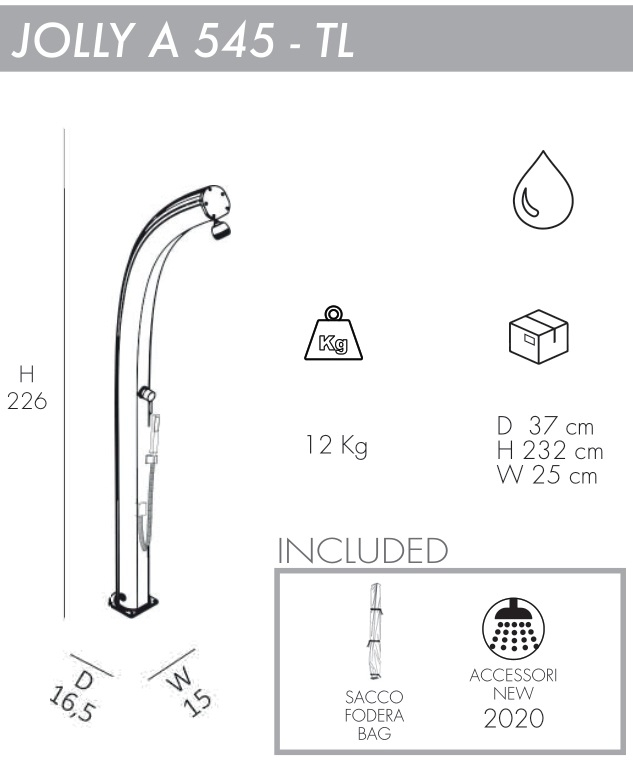 Уличный душJolly A545-TLс инновационным и оригинальным дизайном, выполненный со специальной отделкой и по технологиям последнего поколения, гарантирует смелую эстетику. Благодаря крупным вложениям, дизайнерскому решению и сложной системе окраски, Arkema создалауникальные уличные душив своем роде, с технологией покраски, используемой в автомобильном секторе.Его цвета - то, что отражает его название. Гармония и элегантность форм душа делают его подходящим для любой обстановки, для сада, бассейна или интерьера. Особенности: колонна выполнена изполиэтилена высокой плотности (ПНД) с технологией жидкого и напоминающего металл окрашивания и антикоррозийной обработкой; водоснабжение: горячая и холодная вода; смеситель горячей и холодной воды. Материал - нержавеющая сталь; душевая насадка "тропический душ"; гибкий шланг, благодаря которому удобство в использовании возрастает в несколько раз; устойчивостьк ультрафиолетовым лучам, коррозии, соли и известняку; винты для крепления в комплекте; возможность крепления к песку или газону с помощью винта D125 и меламиновой плиты D180 (приобретаются отдельно); возможность антивандального крепления с помощью кронштейна D120 (приобретается отдельно); чехол для душа D170 в комплекте; размер входящей трубы для подключения воды 1,27 см; широкая палитра цветов: Standard - сатинированноезолото, жемчужный черный, жемчужный белый, изумрудный, а также Special - розовое золото, серебро, сапфир, золотой Ван Гог. Цену за модель, выполненную в расцветке Special, уточняйте у наших менеджеров. Скачать инструкцию по установке. Скачать техническую карту.Характеристики