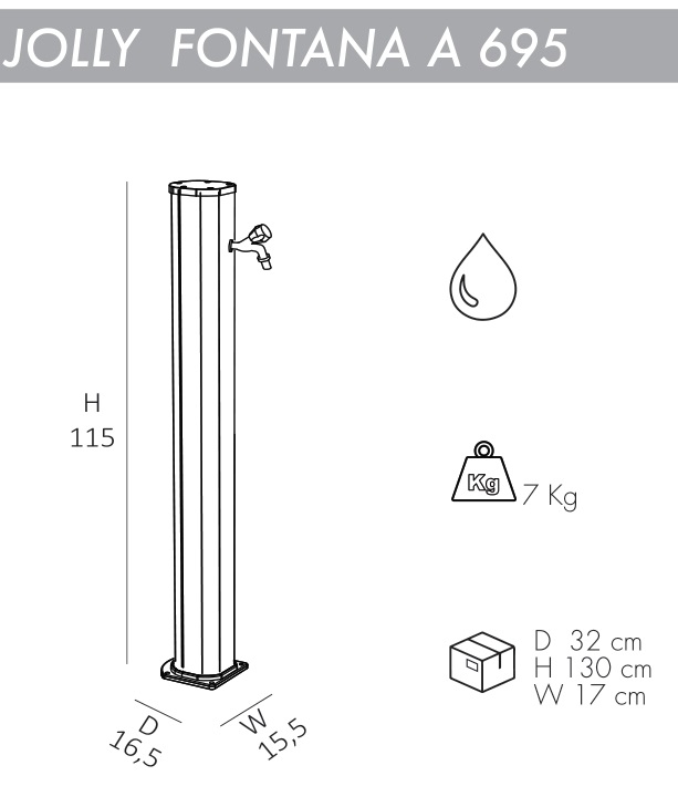 Благодаря своему небольшим размерам и простому управлению душдля ногJolly Fontanaидеально подходит для установки как внутри, так и снаружи помещения, для сада, бассейна илипляжного домика.Чистый дизайн, стильныйи заботливый.Душ оснащен краном, который можно использовать как для мытья ног, так и для подключения садового шланга. Особенности: колонна выполнена изалюминияс порошковым антикоррозийным покрытием, которое обеспечивает долгий срок службы и устойчивость кразличным погодным воздействиям; кран для мытья ног, который также можно использовать для подключения садового шланга; винты для крепления в комплекте; возможность крепления к песку или газону с помощью винта D125 и меламиновой плиты D180 (приобретаются отдельно); простая установка не требует специальных навыков, простое подключение к любому садовому шлангу или постоянному водоснабжению; размер входящей трубы для подключения воды 1,27 см; широкая палитра цветов. Скачать инструкцию по установке. Скачать техническую карту.Характеристики
