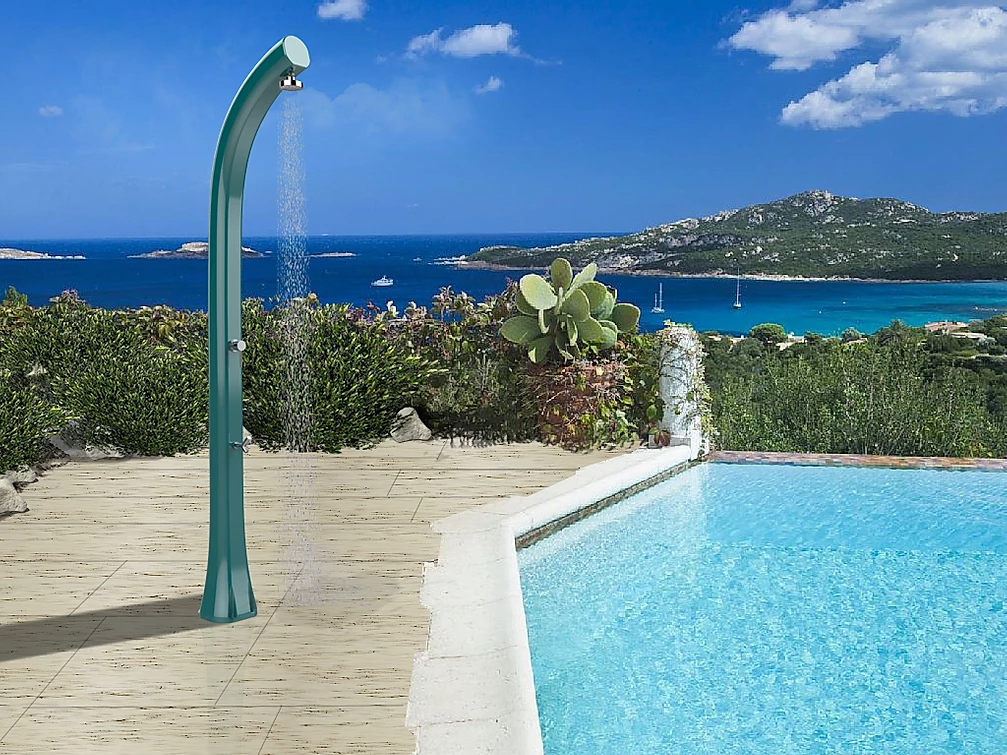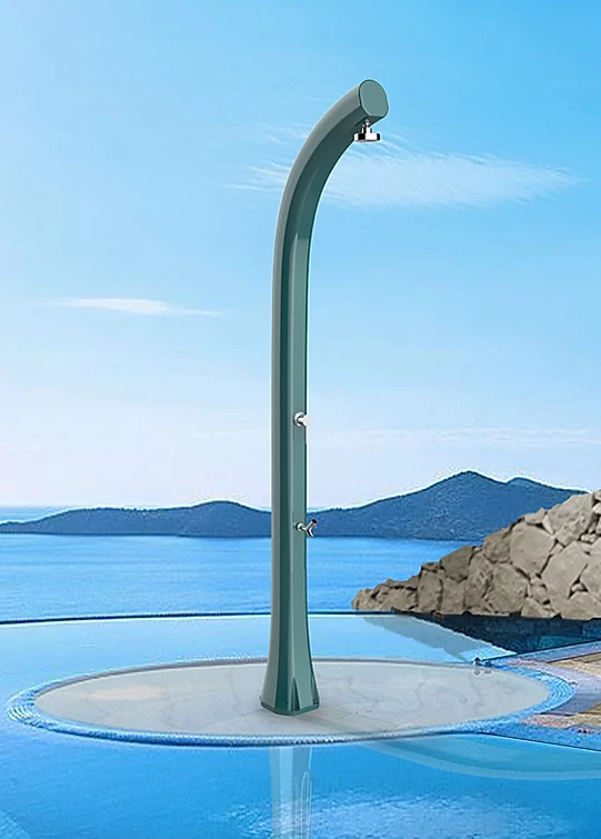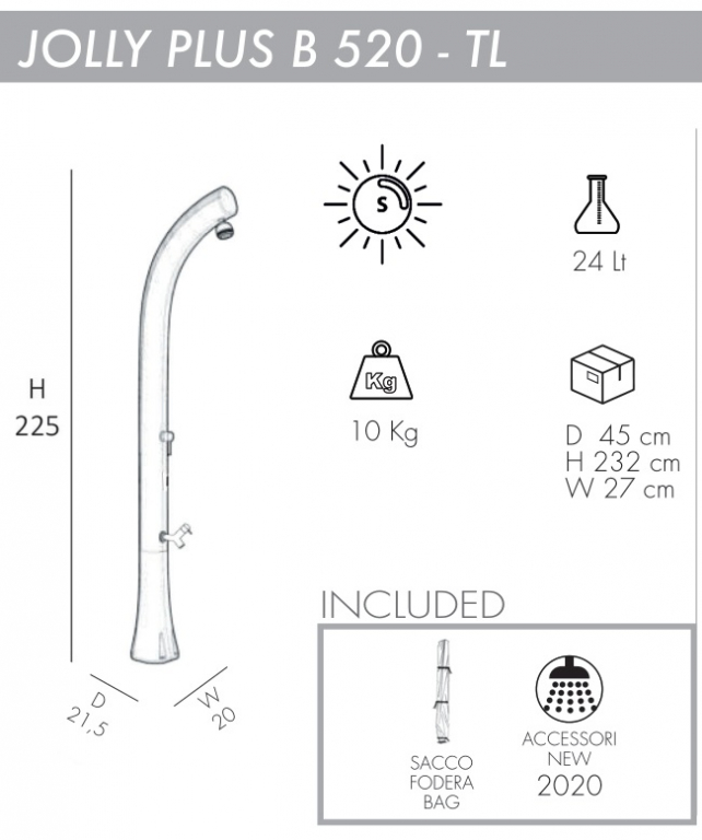 ИнновационныйиоригинальныйдизайнлетнегодушаJolly Plus B520-TLс нагревом воды от солнца, выполненный со специальной отделкой и по технологиям последнего поколения, гарантирует смелую эстетику. Благодаря крупным вложениям, дизайнерскому решению и сложной системе окраски, Arkema создалауникальные уличные душив своем роде, с технологией покраски, используемой в автомобильном секторе.Его цвета - то, что отражает его название. Гармония и элегантность форм душа делают его подходящим для любой обстановки.Солнечный душ Jolly Plus B520-TL подходитдля установки на открытом воздухе в гостиницах, кемпингах, туристическихили пляжных курортах,илидля частного использования.В нижней части корпуса душа находится дополнительный кран, который удобно использовать для мытья ног. Особенности: колонна выполнена изполиэтилена высокой плотности (ПНД) с технологией жидкого и напоминающего металл окрашивания и антикоррозийной обработкой; смеситель горячей воды из бака и холодной воды из источника. Материал - нержавеющая сталь; душевая насадка NEW 2020; кран для мытья ног; емкость для воды на 24л; нагрев воды от солнечных лучей; устойчивостьк ультрафиолетовым лучам, коррозии, соли и известняку; размер входящей трубы для подключения воды 1,27 см; винты для крепления в комплекте; возможность крепления к песку или газону с помощью винта D125 и меламиновой плиты D180 (приобретаются отдельно); чехол для душа D170 в комплекте; широкая палитра цветов: Standard - сатинированноезолото (1200), жемчужный черный (7300), жемчужный белый (9400), изумрудный (6700), а также Special - розовое золото (1100), серебро (1300), сапфир (5600), рубин (3500). Цену за модель, выполненную в расцветке Special, уточняйте у наших менеджеров. Скачать инструкцию по установке. Скачать техническую карту. Принцип работы максимально прост, что делает солнечный душ популярным атрибутом пляжныхкурортов. Вода, хранящаяся в корпусе душа, нагревается за счет солнца. Нагретая вода смешивается с холодной водой из источника постоянного водоснабжения (или из садового шланга). При помощи смесителя возможна регулировка потокагорячей и холодной воды до температуры комфорта. На зимний период воду из внутреннего бака и шлангов необходимо сливать!Характеристики