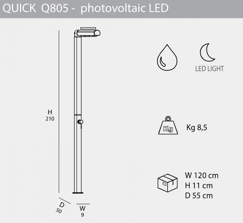 Инновационный и оригинальный душ со светодиодной подсветкойQuick Q805идеально подходит для установки как внутри помещения, так и на открытом воздухе, для сада, бассейна илипляжного домика.Чистый дизайн, элегантный и заботливый дизайн.Традиционные уличные души Quick отличаются тем, что их можно разобрать. Душ со смесителем горячей/холодной воды.Душ особенно подходит для использования на открытом воздухе в темное время суток. Установка выполняется без проблем, простое подключение к постоянномуводоснабжению холодной и горячей воды. Особенности: колонна выполнена изалюминияс порошковым антикоррозийным покрытием, которое обеспечивает долгий срок службы и устойчивость кразличным погодным воздействиям; водоснабжение: горячая и холодная вода; смеситель горячей и холодной воды обеспечиваетвыборнужной температуры воды. Материал - хромированнаялатунь; встроенная регулируемая душевая насадка с возможностью выбора угла наклона 0° - 30° - 60° - 90°; фотогальваническая LED подсветка для ночного использования; устойчивостьк ультрафиолетовым лучам, коррозии, соли и известняку; винты для крепления в комплекте; простая установка душа; возможность крепления к песку или газону с помощью винта D125 и меламиновой плиты D180 (приобретаются отдельно); дополнительно для алюминиевых душей Arkema доступен фильтр от известкового налета D150 (приобретается отдельно); размер входящей трубы для подключения воды 1,27 см; широкая палитра цветов. Открыть инструкцию по установке.Характеристики