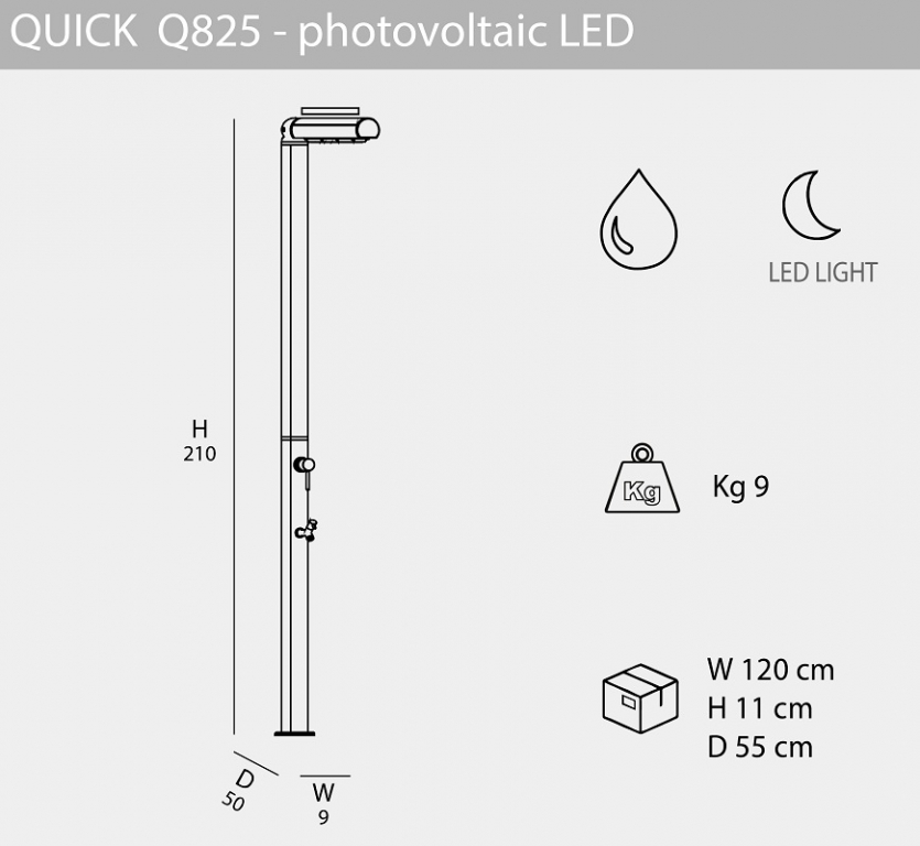 Инновационный и оригинальный душсо светодиодной подсветкойQuick Q825идеально подходит для установки как внутри помещения, так и на открытом воздухе, для сада, бассейна илипляжного домика.Чистый дизайн, элегантный и заботливый дизайн.Традиционные уличные души Quick отличаются тем, что их можно разобрать. Душ со смесителем горячей/холодной воды.В нижней части корпуса душа находится дополнительный кран, который удобно использовать для мытья ног. Душ особенно подходит для использования на открытом воздухе в темное время суток. Установка выполняется без проблем, простое подключение к постоянномуводоснабжению холодной и горячей воды. Особенности: колонна выполнена изалюминияс порошковым антикоррозийным покрытием, которое обеспечивает долгий срок службы и устойчивость кразличным погодным воздействиям; водоснабжение: горячая и холодная вода; смеситель горячей и холодной воды обеспечиваетвыборнужной температуры воды. Материал - хромированнаялатунь; встроенная регулируемая душевая насадка с возможностью выбора угла наклона 0° - 30° - 60° - 90°; фотогальваническая LED подсветка для ночного использования; кран для мытья ног; устойчивостьк ультрафиолетовым лучам, коррозии, соли и известняку; винты для крепления в комплекте; простая установка душа; возможность крепления к песку или газону с помощью винта D125 и меламиновой плиты D180 (приобретаются отдельно); дополнительно для алюминиевых душей Arkema доступен фильтр от известкового налета D150 (приобретается отдельно); размер входящей трубы для подключения воды 1,27 см; широкая палитра цветов. Открыть инструкцию по установке.Характеристики