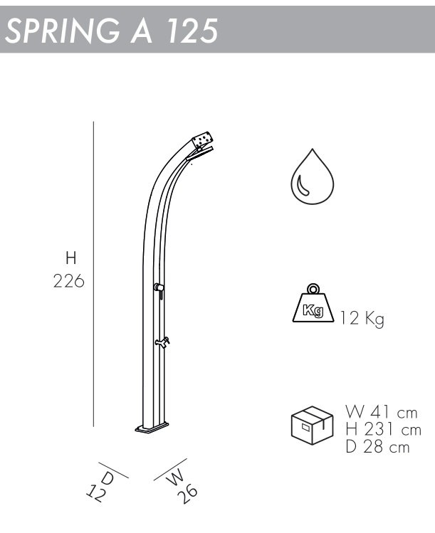 Летний душ Spring A125 с инновационными оригинальнымдизайномидеально подходит для установки как внутри, так и снаружи помещения, для сада, бассейна илипляжного домика.Чистый дизайн, элегантный и заботливый.Душ особенно подходит для использования на открытом воздухе. В нижней части корпуса душа находится дополнительный кран, который удобно использовать для мытья ног. Установка выполняется без проблем, простое подключение к постоянномуводоснабжению холодной и горячей воды. Особенности: колонна выполнена изалюминияс порошковым антикоррозийным покрытием, которое обеспечивает долгий срок службы и устойчивость кразличным погодным воздействиям. Также к заказу доступен душ с отделкой из нержавеющей стали или с полосой из анодированной стали. Цены Вы можете уточнить у наших менеджеров; водоснабжение: горячая и холодная вода; смеситель горячей и холодной воды. Материал - нержавеющая сталь; душевая насадка; кран для мытья ног; винты для крепления в комплекте; возможность крепления к песку или газону с помощью винта D125 и меламиновой плиты D180 (приобретаются отдельно); дополнительно для алюминиевых душей Arkema доступен фильтр от известкового налета D150 (приобретается отдельно); размер входящей трубы для подключения воды 1,27 см; широкая палитра цветов. Скачать инструкцию по установке. Скачать техническую карту.Характеристики